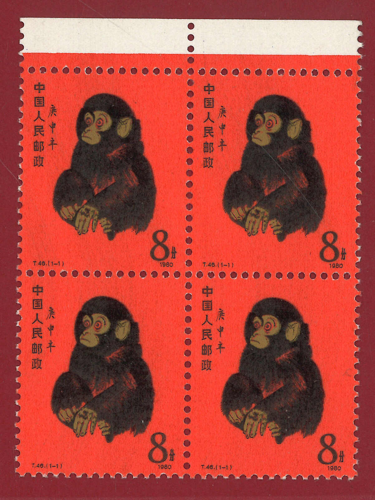 1980 T46 Year of Monkey in block of 4 with top margin. MNH with original gum.