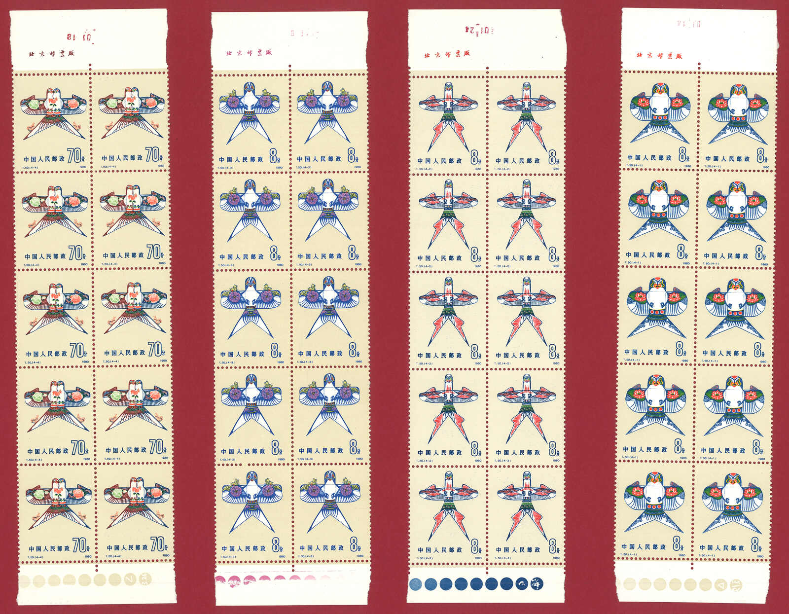 1980年T50風箏十方連新,帶上廠銘及下色標。原膠無貼,齒間有折,微黃。(Image 1)