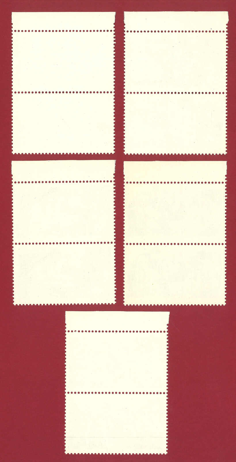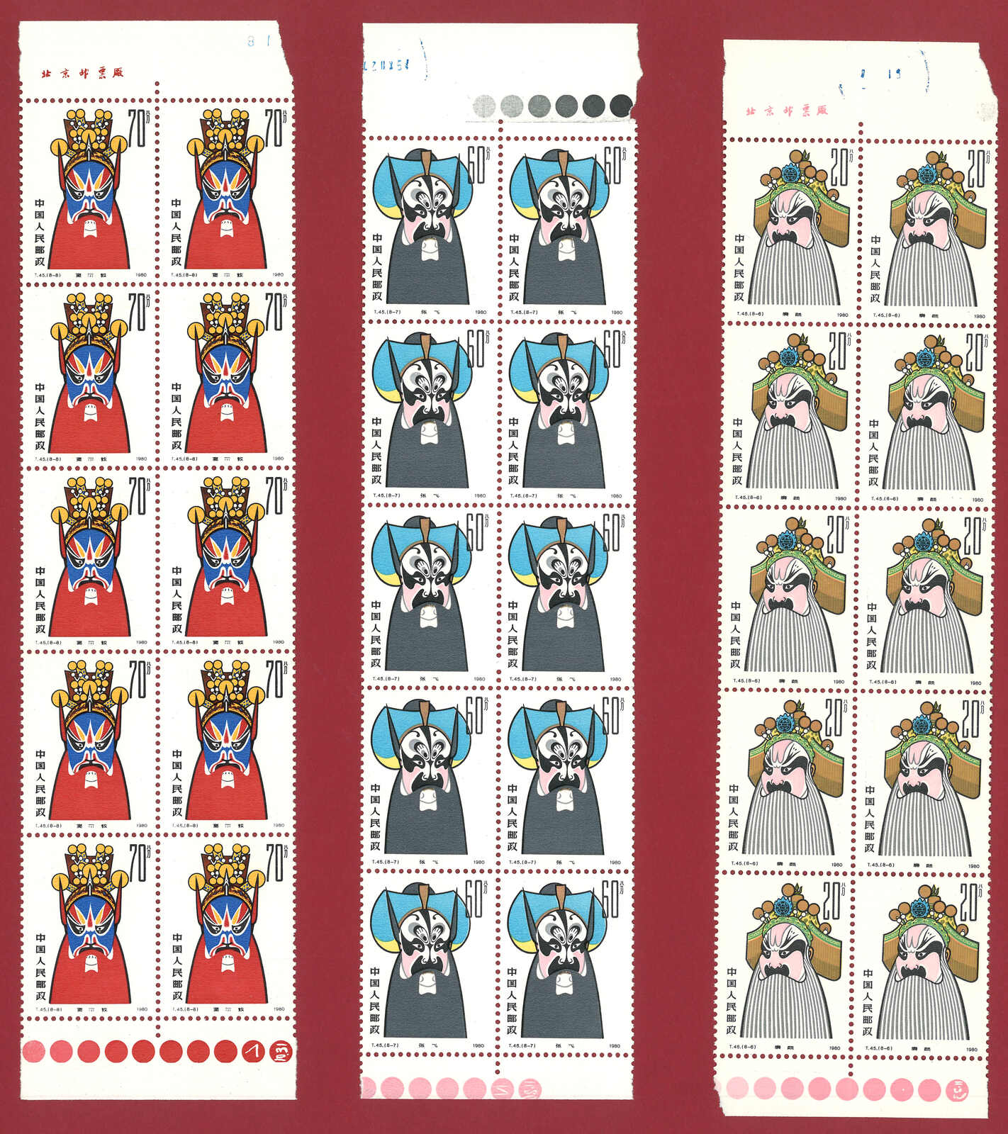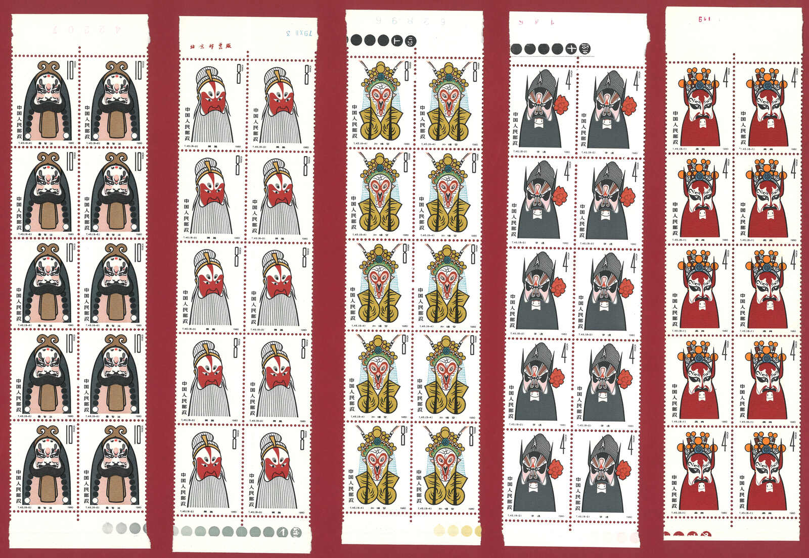 1980年T45京戲臉譜十方連新全,帶上下色標。部分帶廠銘。原膠無貼,齒間有折,微黃。(Image 1)