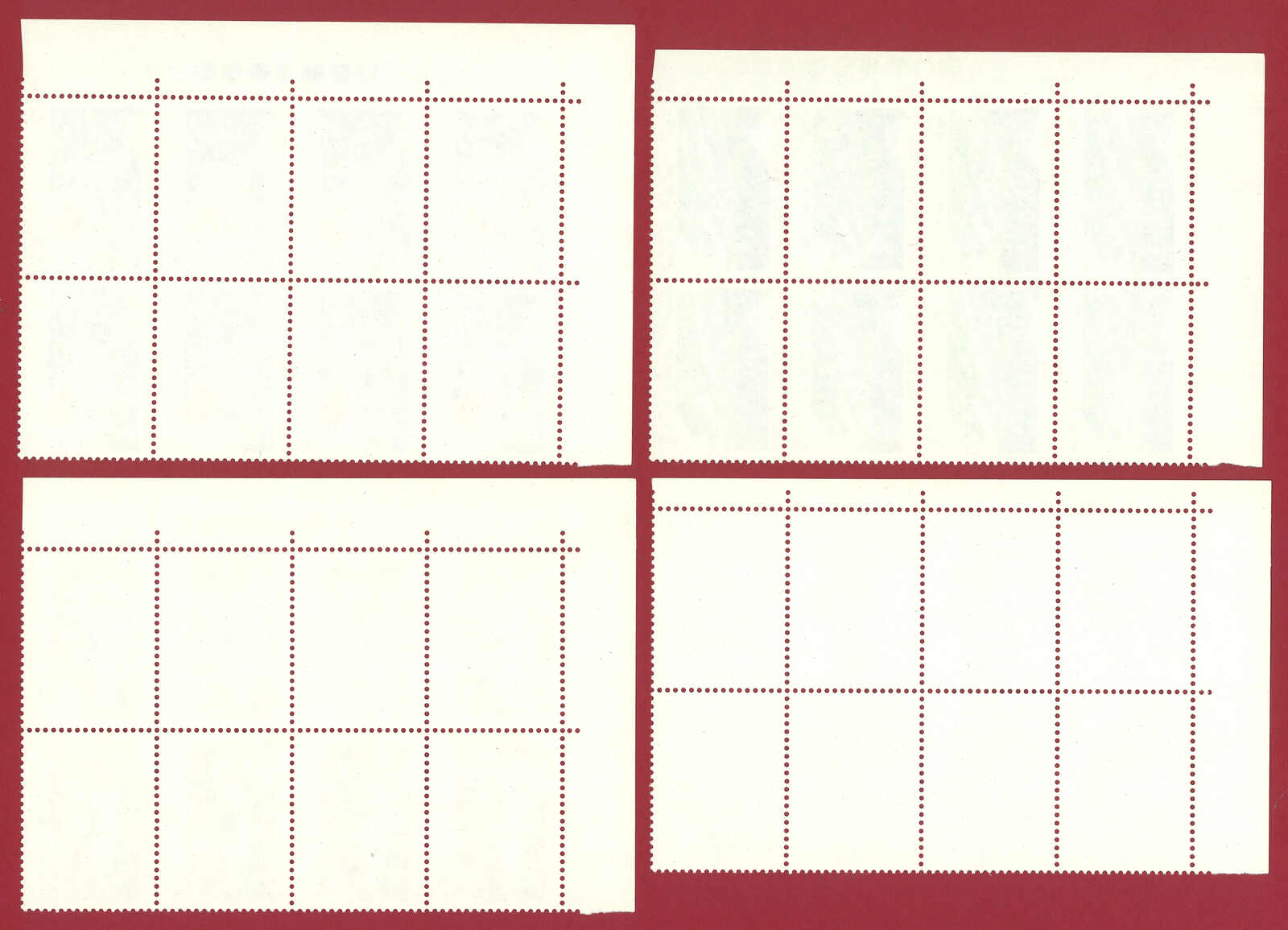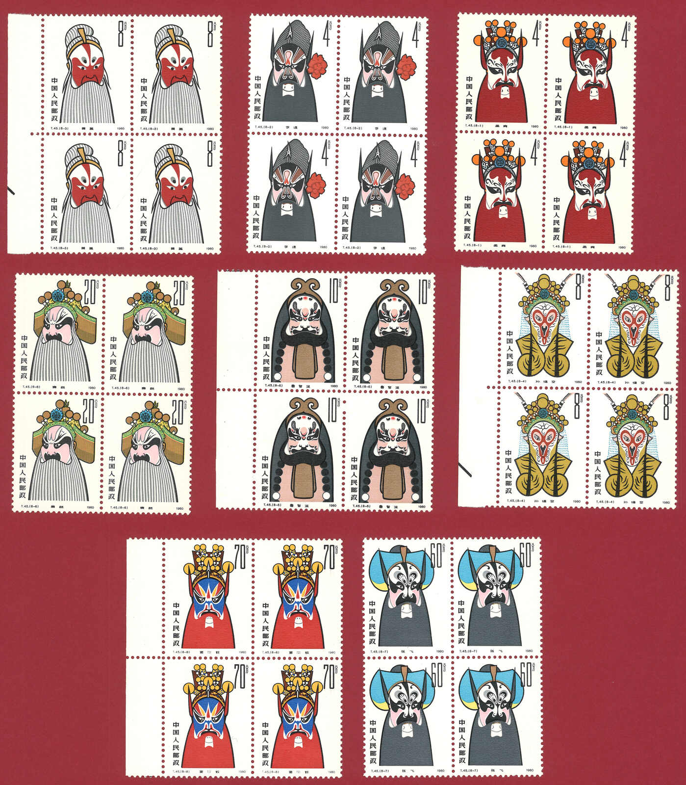 1980 T45 Facial Makeups in Beijing Opera in 2 sets of blocks of 4, in total of 8 sets. One set with imprint margin. MNH with original gum. Light toning.