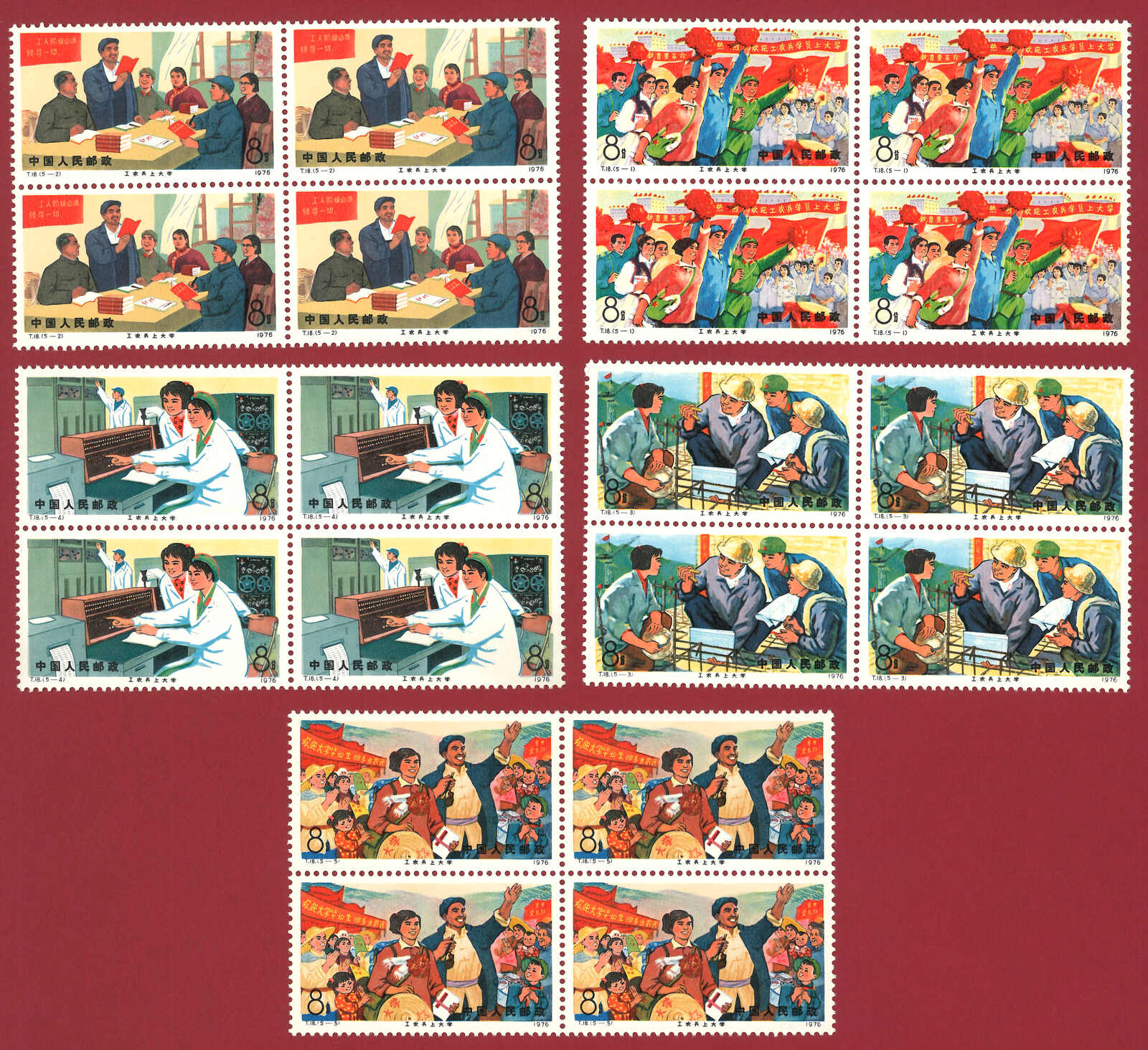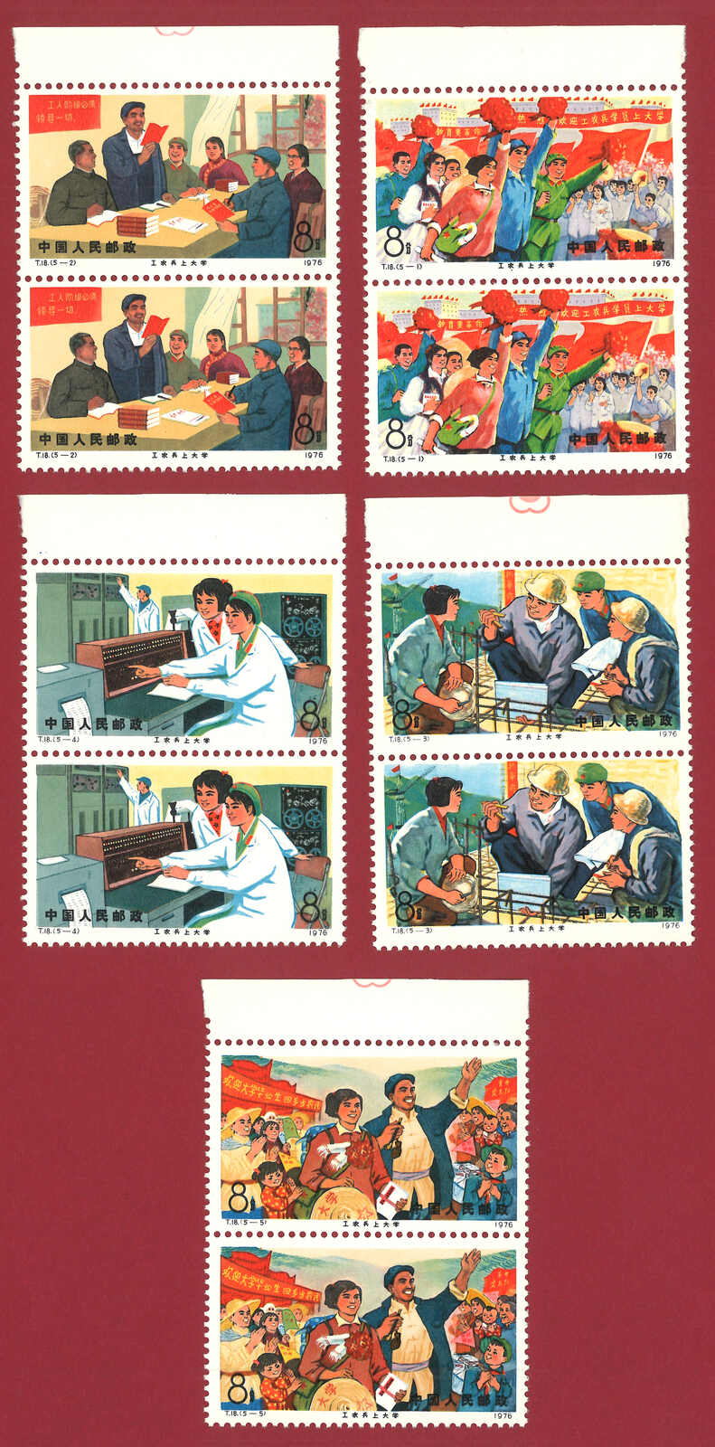 1976 T18 Workers, Peasants and Soldiers Go to College complete set in vertical pair and block of 4, in total of 6 sets. Former with top margin. MNH with original gum. Light toning.