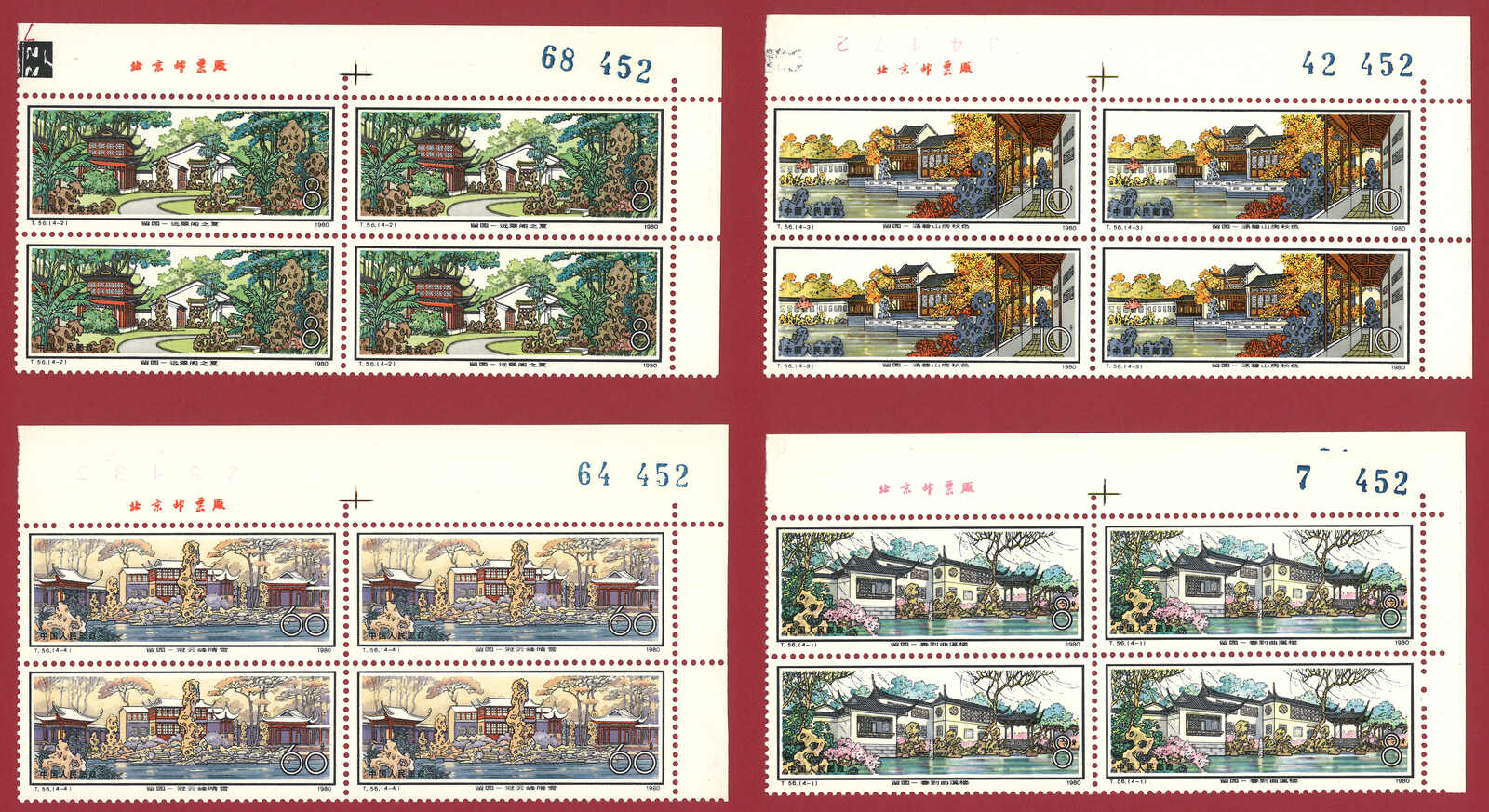 1980 T56 Sochow Garden: Liu Yuan complete set in block of 4 with top right corner imprint margin and plate number. MNH with original gum. Light toning.