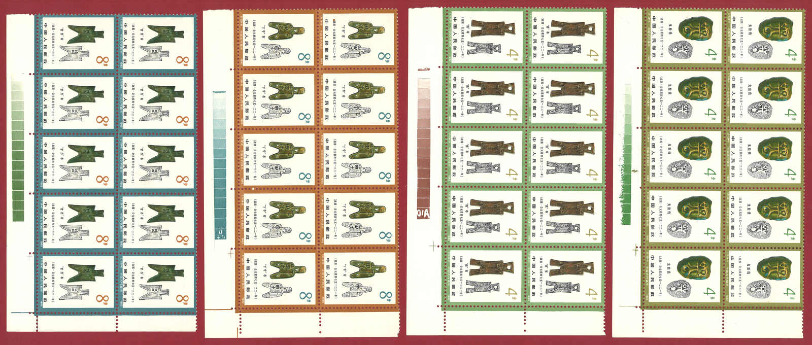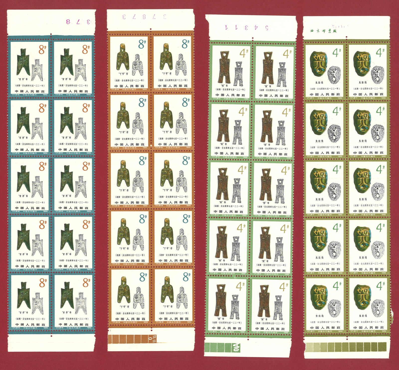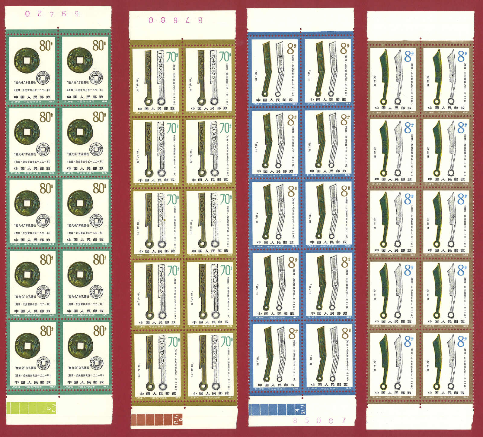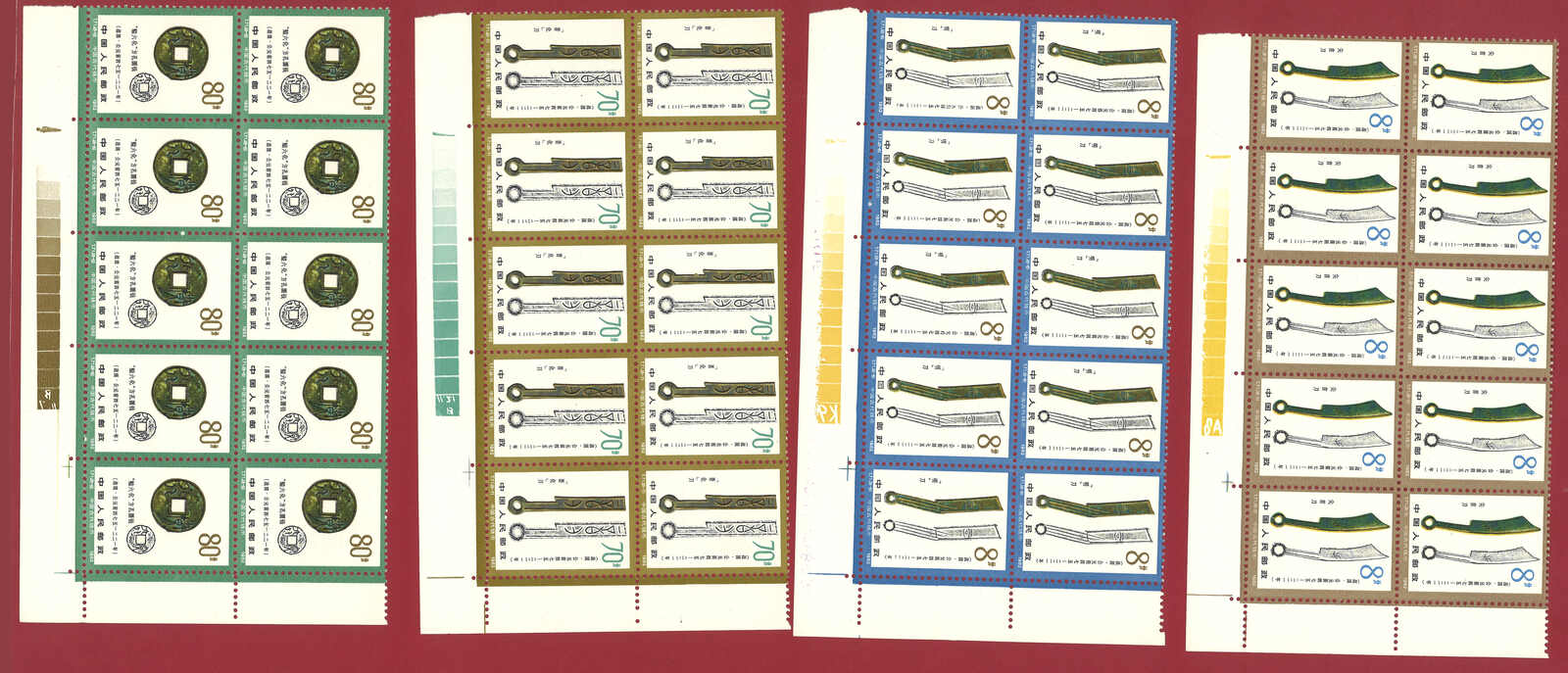 1982 T71 Ancient Coins of China (2nd Series) in 2 sets of blocks of 10 with margin, in total of 20 sets. MNH with original gum. Light toning. Folded along perf.