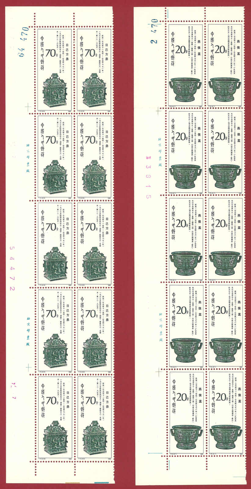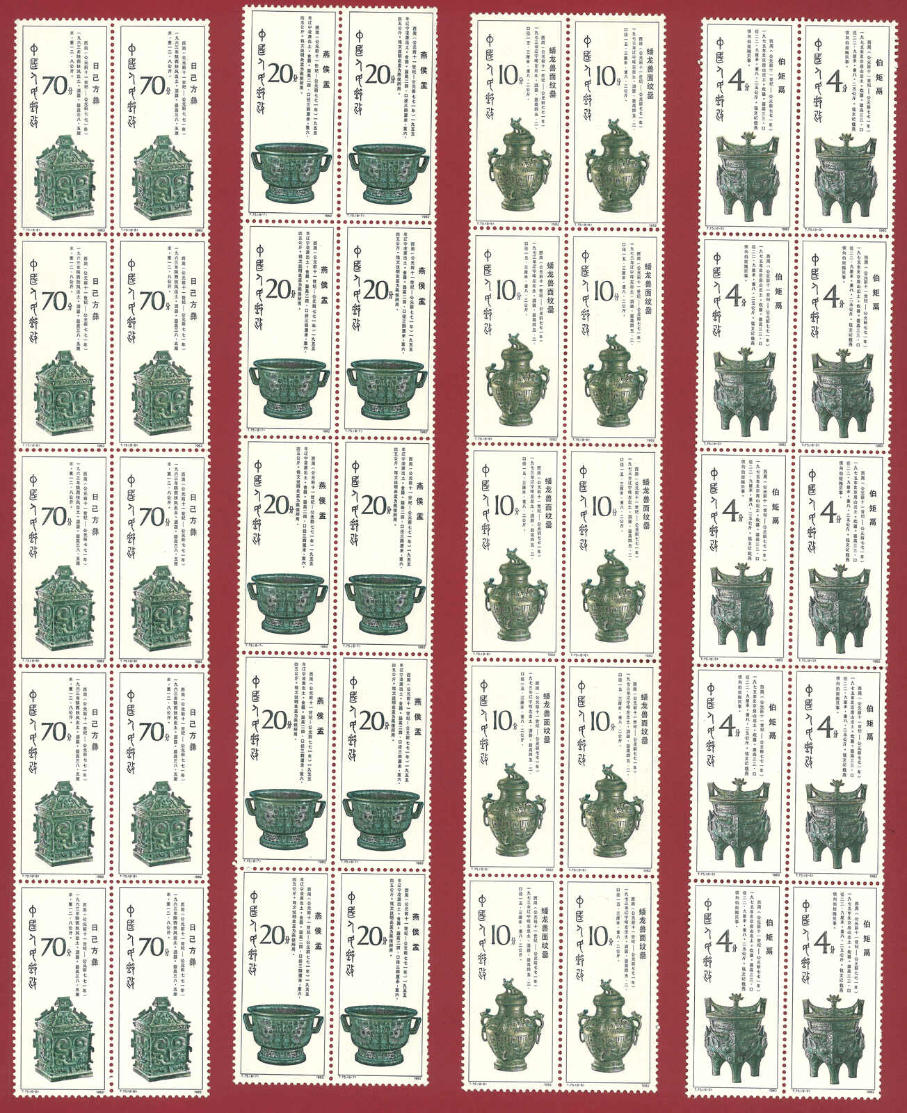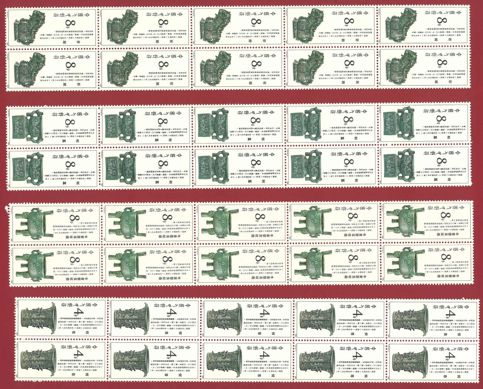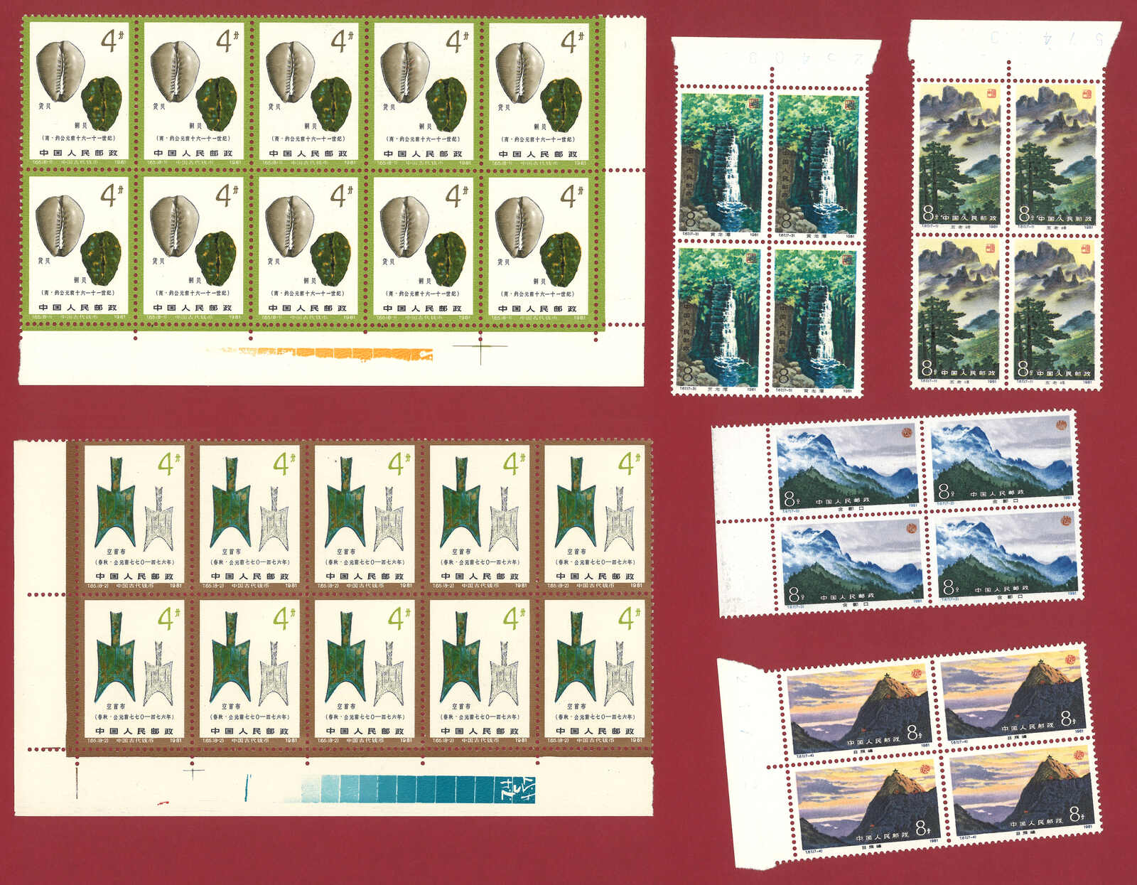 1982 T71 Ancient Coins of China (2nd Series) in 2 sets of blocks of 10 with margin, in total of 20 sets. MNH with original gum. Light toning. Folded along perf.