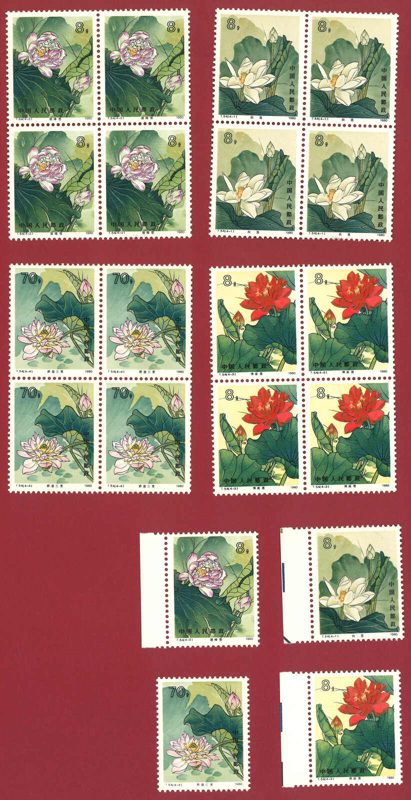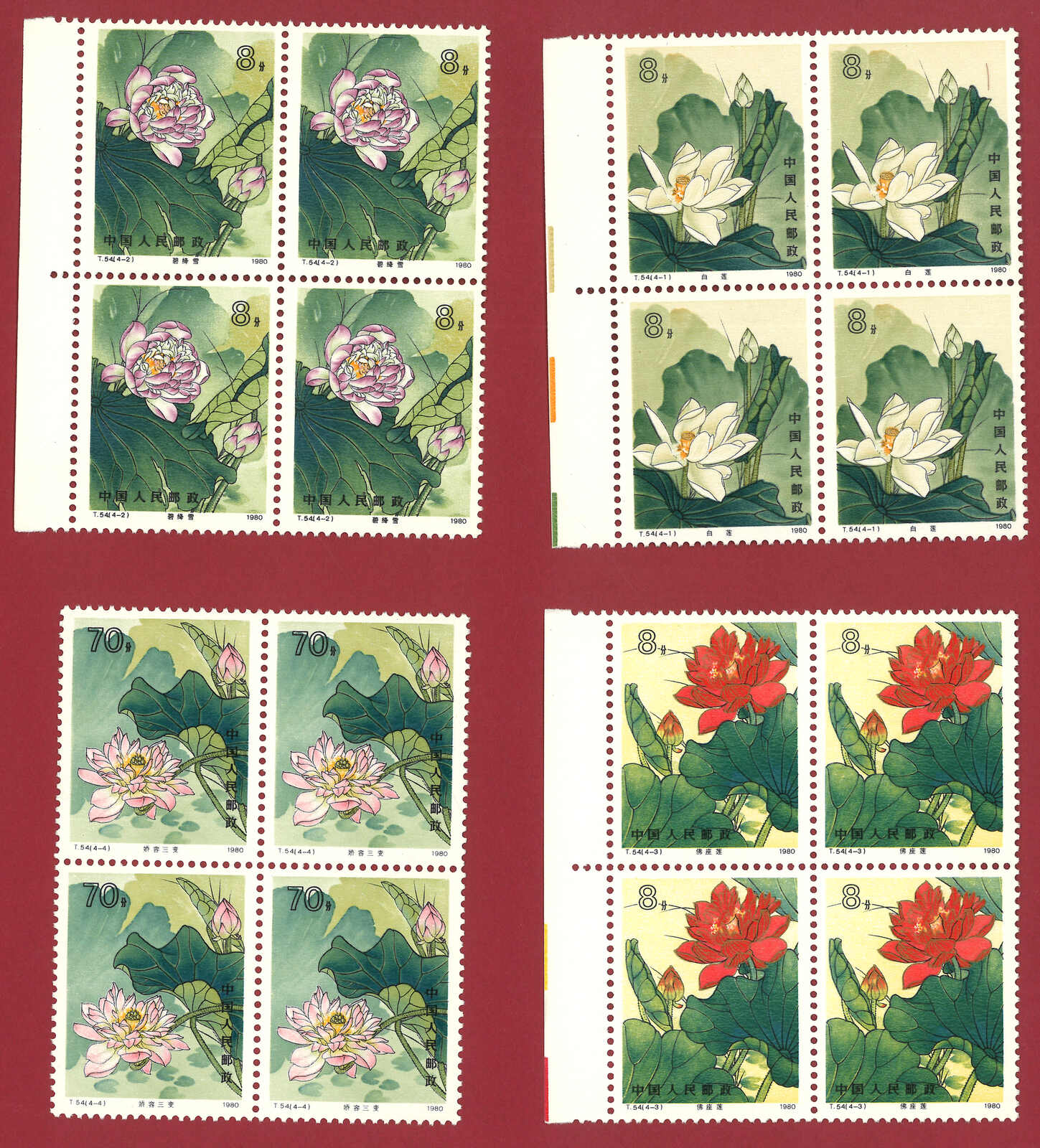 1980年T54荷花新全共9套,包含2套四方連及1套單枚。原膠無貼,微黃。(Image 1)