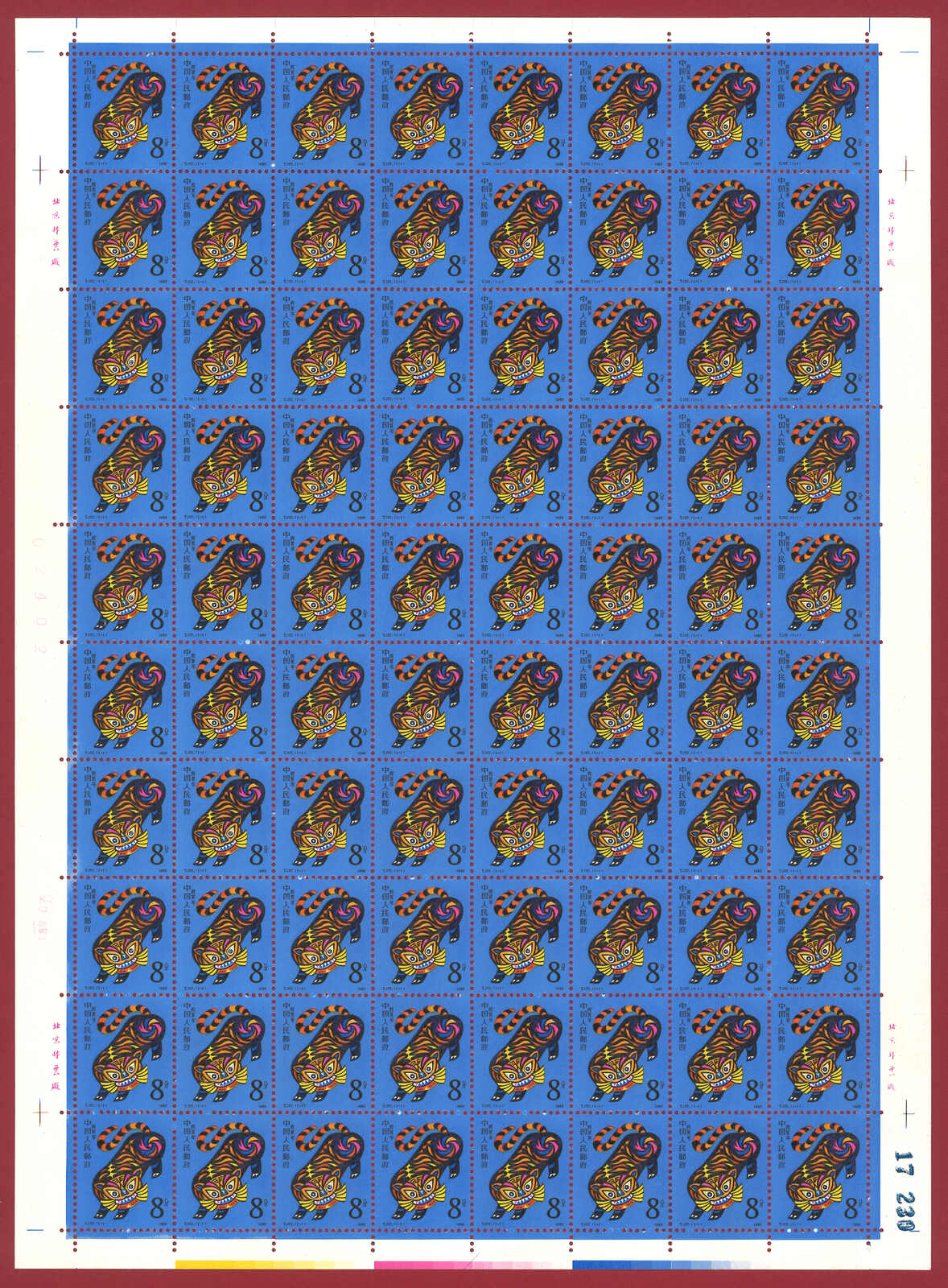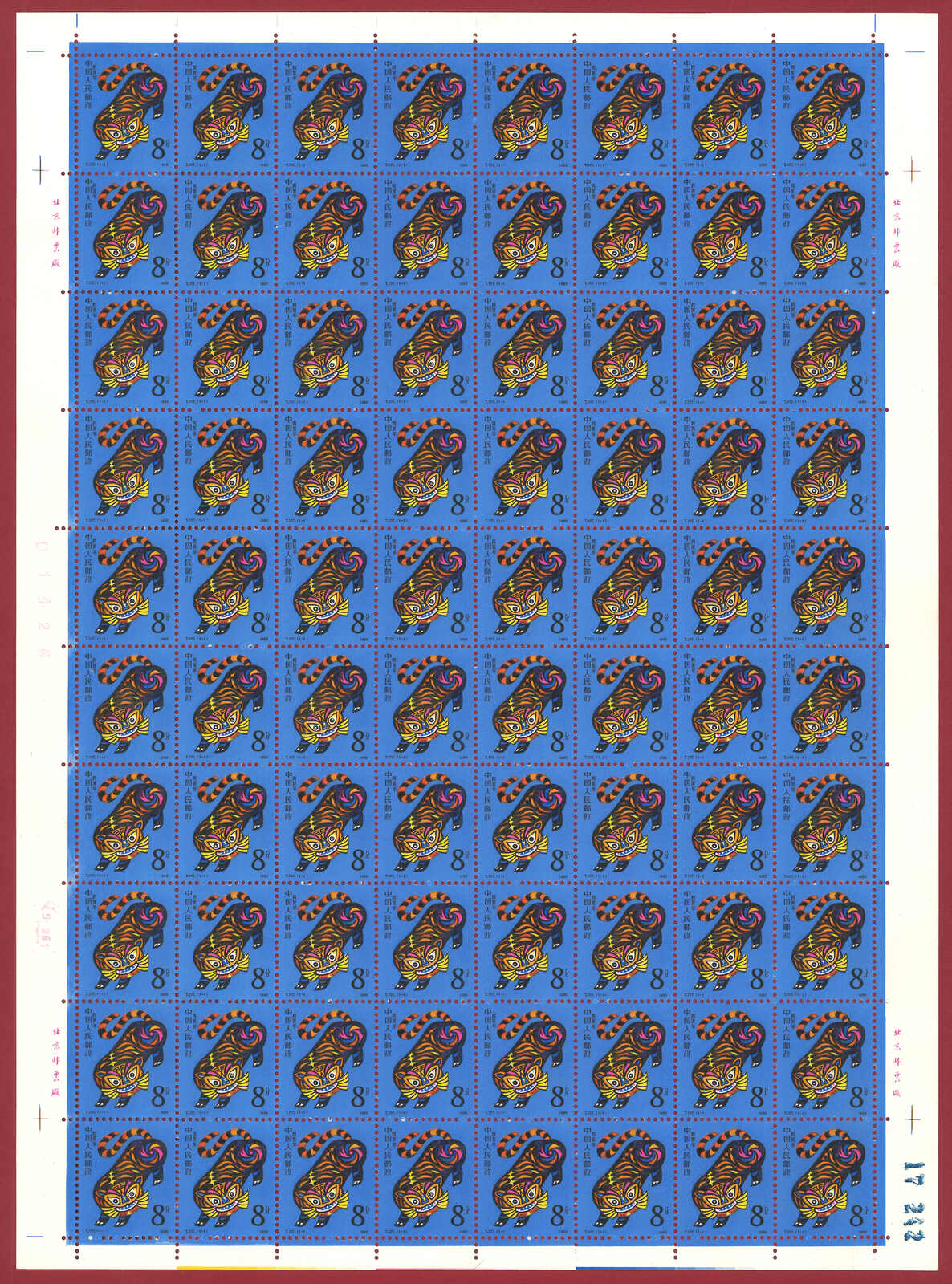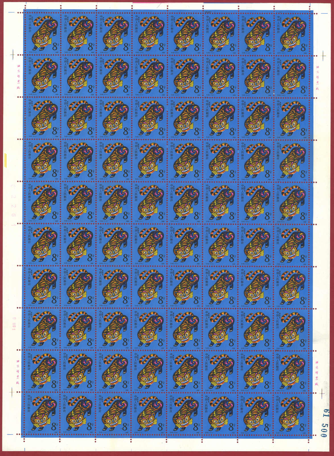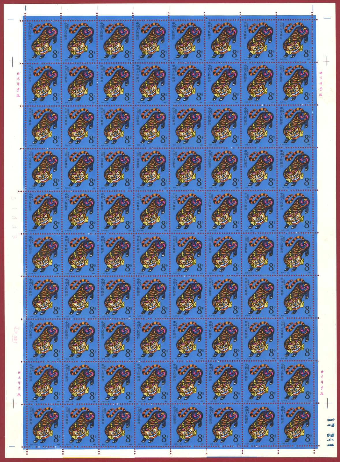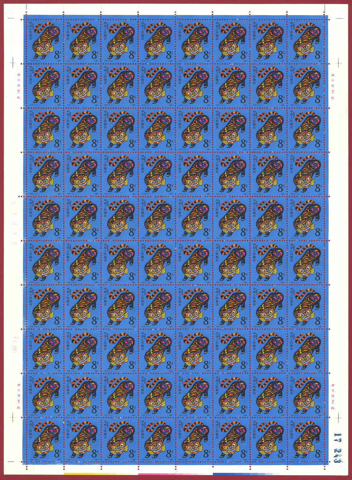 1986年T107丙寅年(虎年)版票80枚新,合5版共400枚票。原膠無貼,微黃。(Image 1)