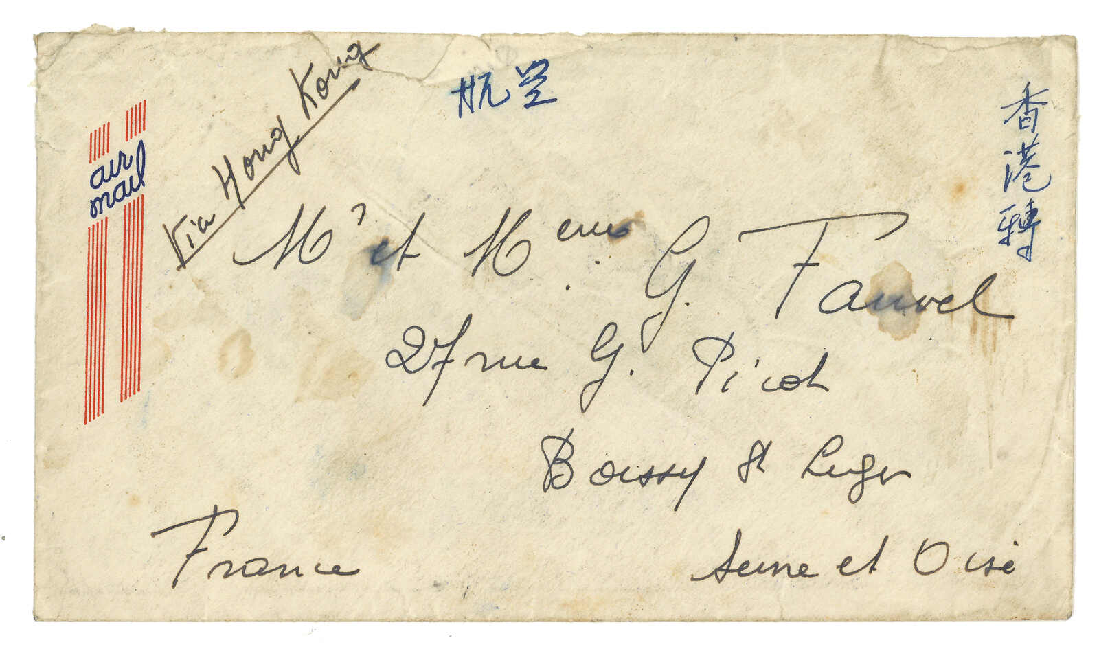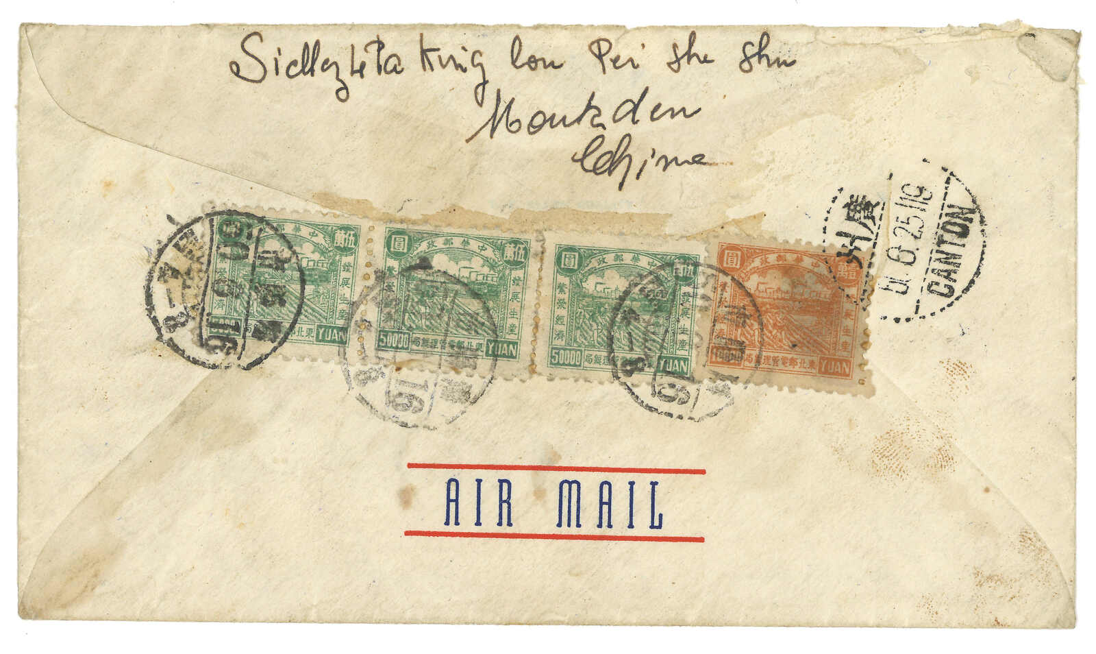 1950.6.16 瀋陽寄法國,背貼東北郵電管理局生產圖5萬元x3 + 10萬元,銷瀋陽市三格日戳。6.25經廣州。寫有英文批示指示於香港中轉。1950年2月2日,新中國恢復空郵服務,然而此封仍指示經香港中轉。貼東北解放區票寄外國亦甚少見。(Image 1) (Image 2)