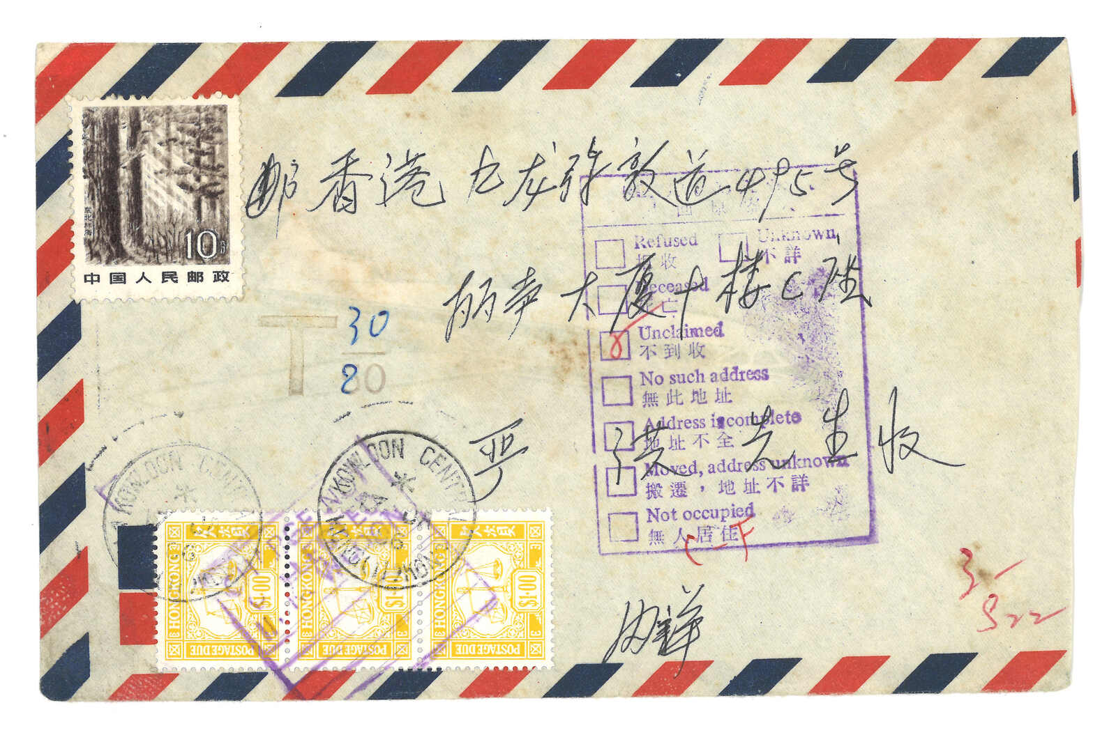 1986年中國大陸寄香港欠資封,貼普票10分但未蓋銷,鈐T章。加貼香港欠資票1元直三連,銷九龍中央郵局日戳。背面鈐九龍退信局2.19日戳,兼貼欠資通知。(Image 1) (Image 2)