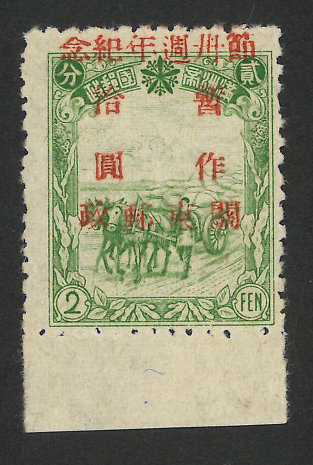 1607 * image1947 Kwantung Post 30th Anniv of the Red Army Day surch $10 on Manchukuo 2f, with overprint shifted upward variety (Yang AD32a), MLH.