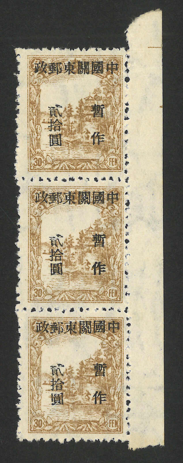 1605 **/bof image1947 Manchukuo regular issue surch Chinese Kwantung Post $20 on 30f in vertical strip of 3 with right margin (Yang AD31), MNH.