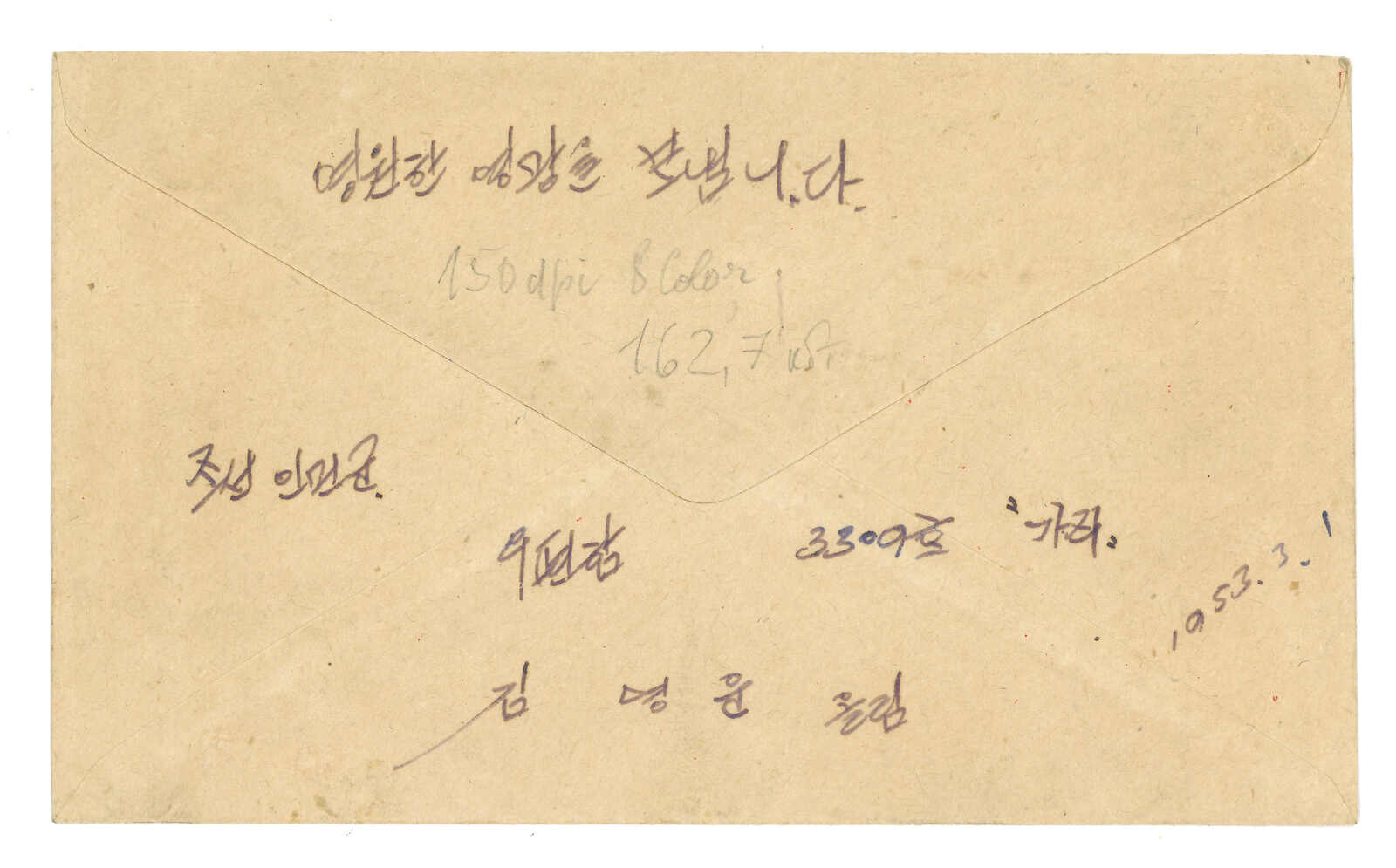 1953.3.1 中國人民赴朝慰問團封,鈐朝鮮人民軍軍郵局圓戳。(Image 1) (Image 2)