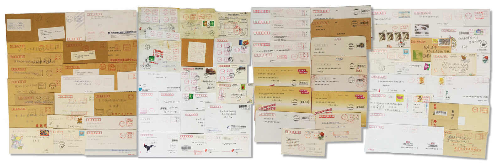 2000年代一組約50件新中國封片、包裹單、剪片等,鈐郵資已付機戳,地名包括北京、廣州、天津、江蘇、陝西等省市, 十分豐富。(Image 1)