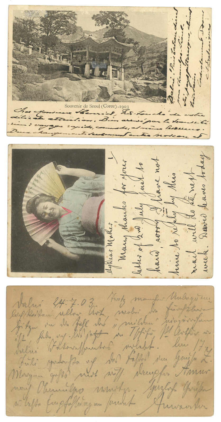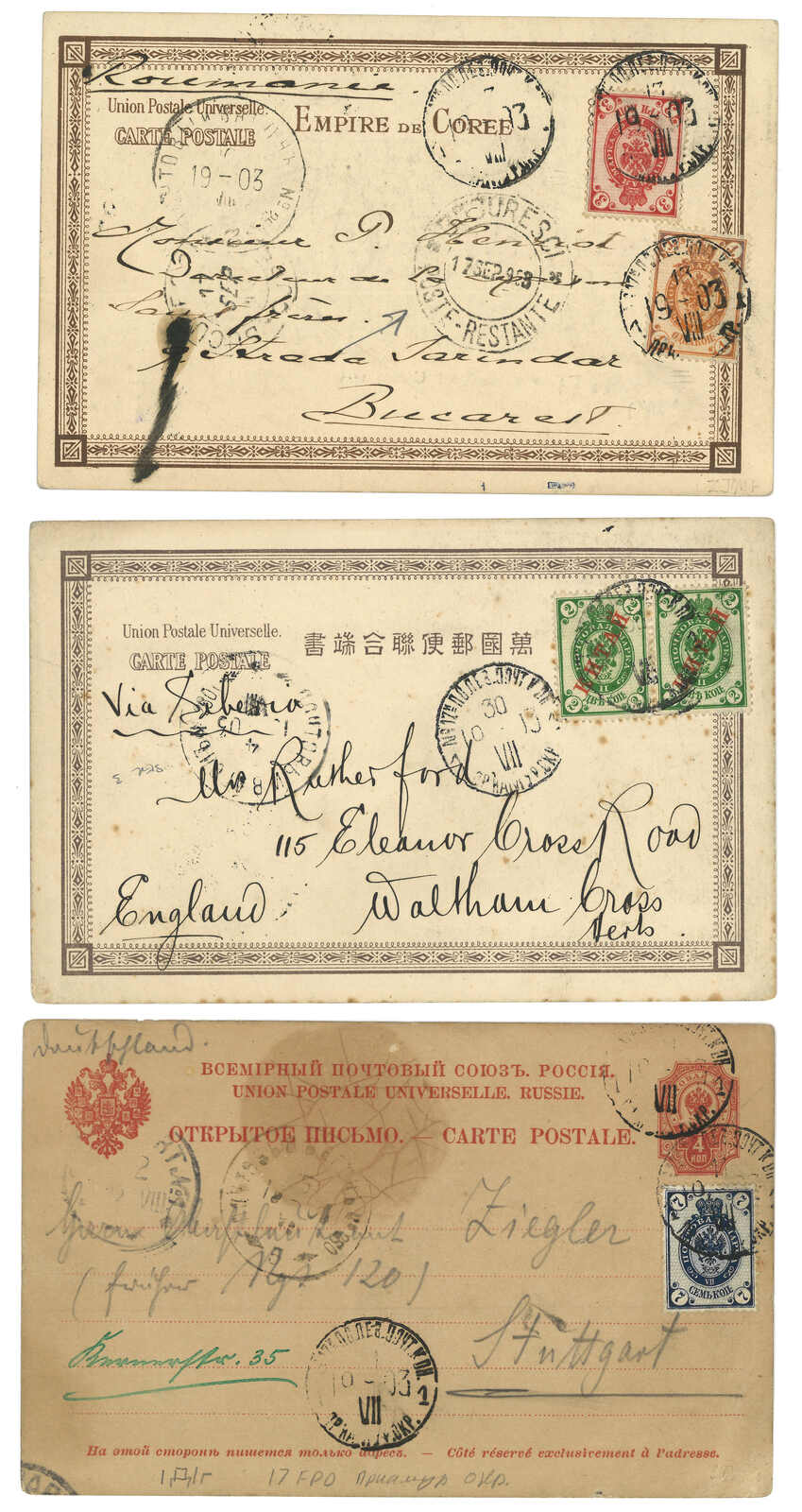 3145 imagePORT ARTHUR. 3x PPC from Port Arthur f.w. Arms with or without KATAI ovpt, tied by 17th FPO in 1903. Transit Postal Wagon 260 to Germany or Romania.