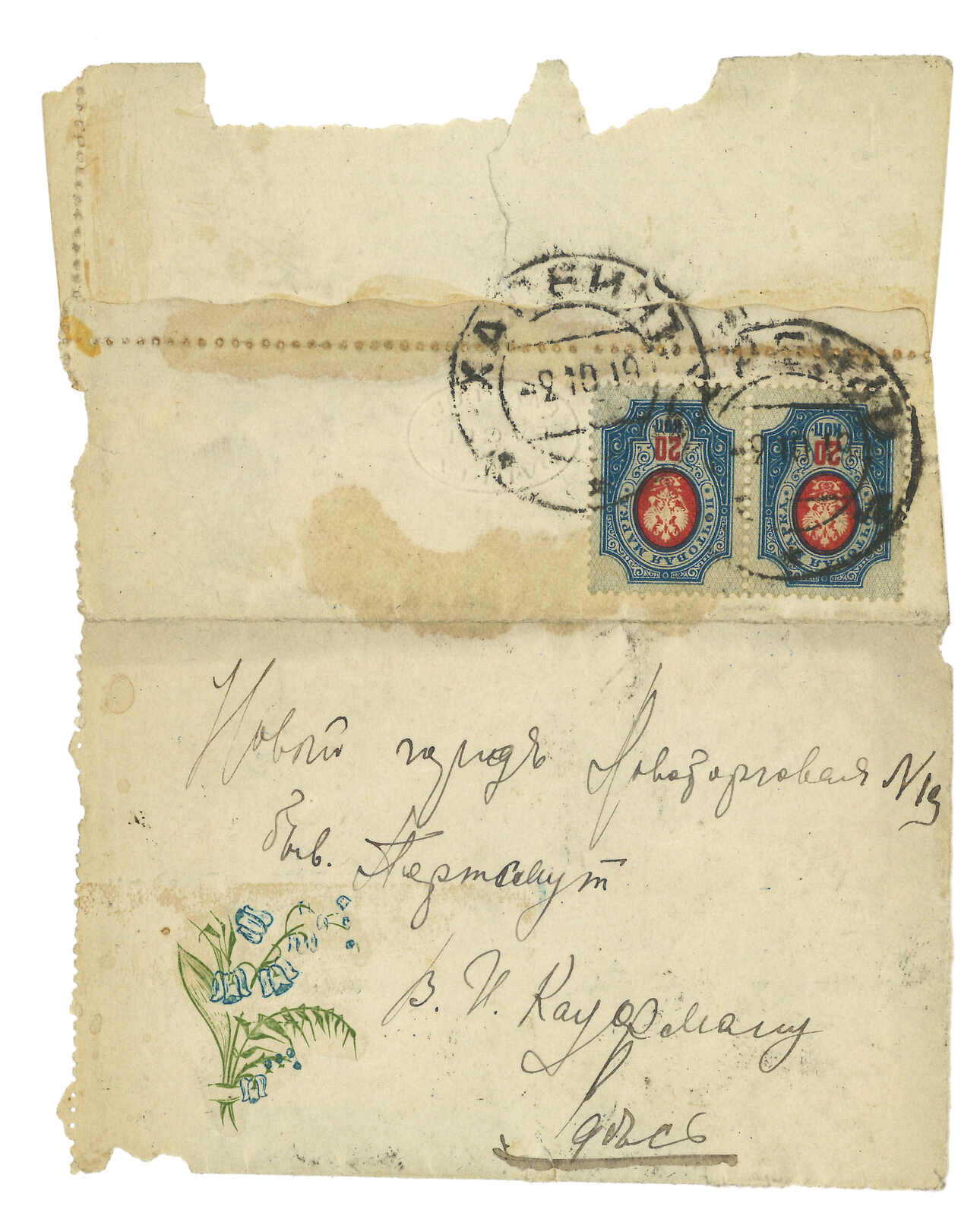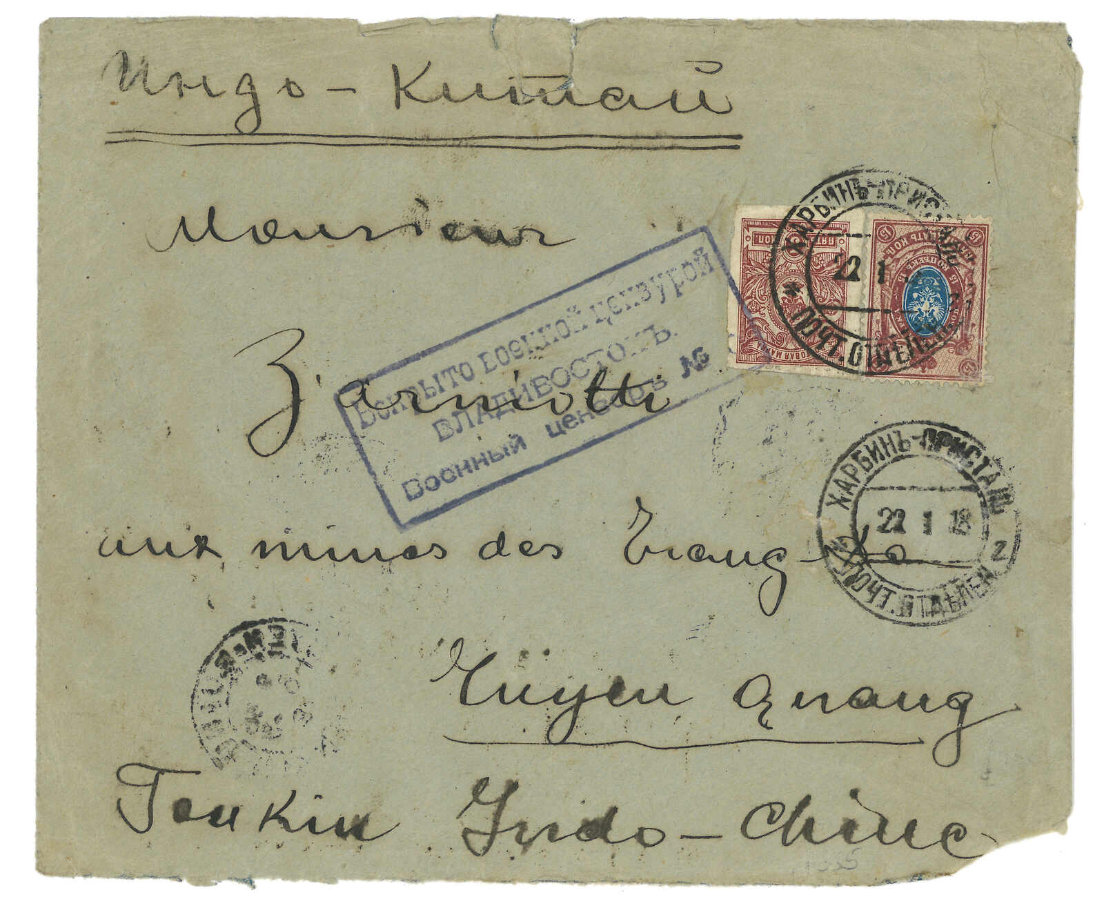 1918.1.22 哈爾濱碼頭寄法屬印支,貼俄國軍徽圖15戈比 + 5戈比,銷哈爾濱碼頭日戳,旁鈐俄文檢查章。2.24經上海中國郵局。3.6抵Tuyen Quang,鈐東京檢查章。由俄國客郵局寄印支十分少見。(Image 1) (Image 2)