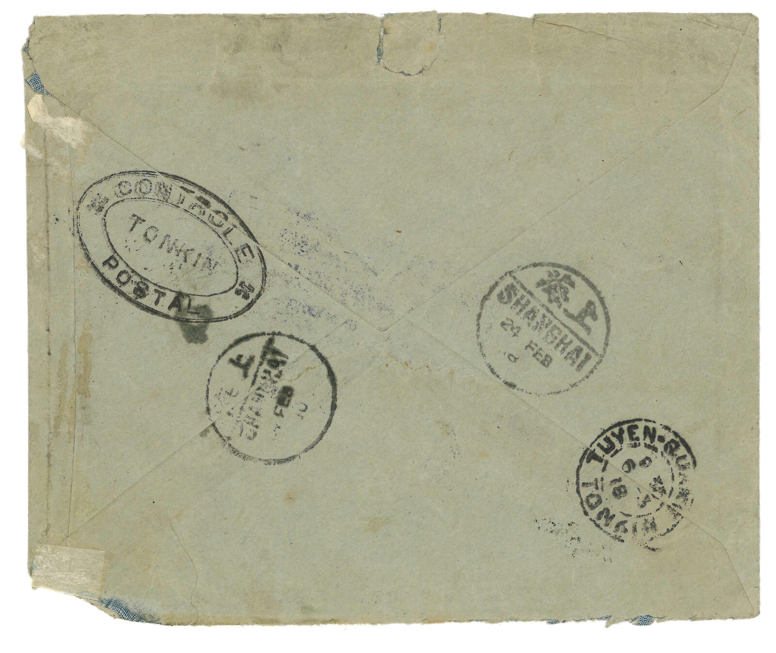 3157 image1918 Harbin Pier (22 Jan) to French Indochina, f.w. Russian Coat of Arms 15k + 5k, tied by Harbin Pier cds., alongside with Russian censor mark. Transit Shanghai Chinese PO (24 Feb). Arrived Tuyen Quang (6 Mar) with Tonkin oval censor mark. Sending to French Indochina from Russian PO is rather scarce.