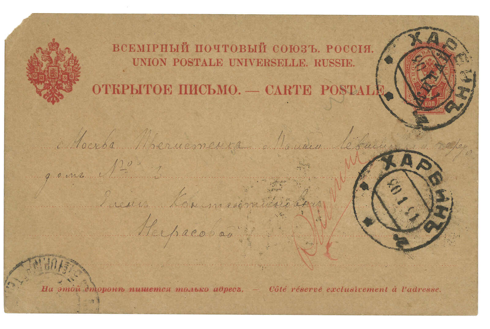 3154 image1903 Harbin (16 Jun) to St. Petersburg. Picture postcard, f.w. Coat of Arms 3k, tied by Harbin Central Station T&S type 1 cds. Arrived St. Petersburg (1 Jul).