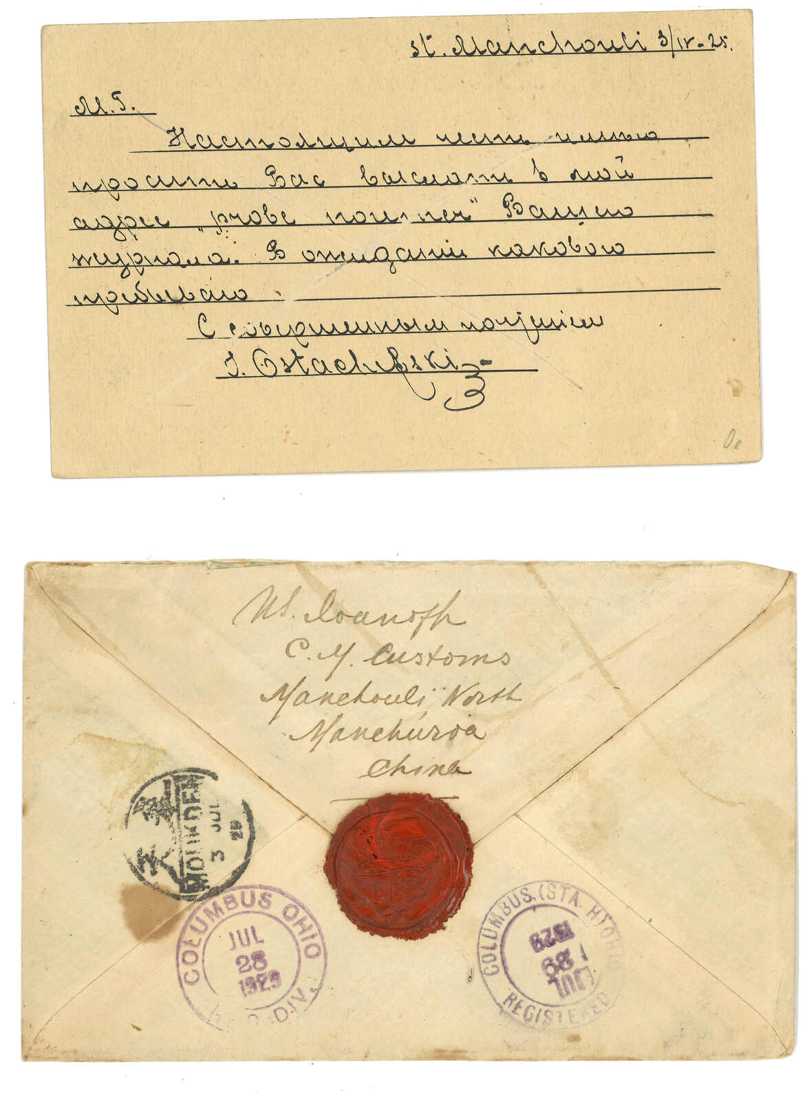 1592 cover image1925 and 1929 a pair of stationery card and cover from Manchouli to Russia and USA, applied with Manchouli A and Manchouli B bisected bilingual cds respectively. Mails originating from, instead of transit at, Manchouli are scarce.