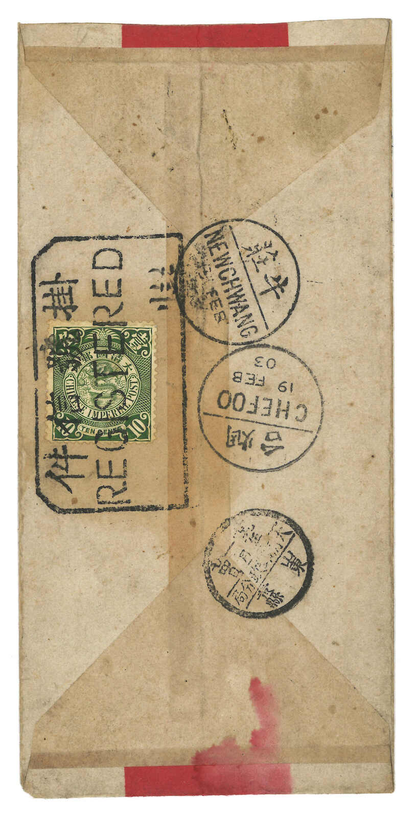 1590 cover image1903 Kaiyuen to Hwanghsien, Registered red band cover, f.w. Coiling Dragon 1c in pair on front and 10c on reverse, tied by Kaiyuen PO tombstone cancel and Newchwang bilingual registered mark respectively. Transit Newchwang (15 Feb), Chefoo (19 Feb). Arrived Hwanghsien Imperial Branch PO (21 Feb). Gathering mulitple scarce postmarks on one example.