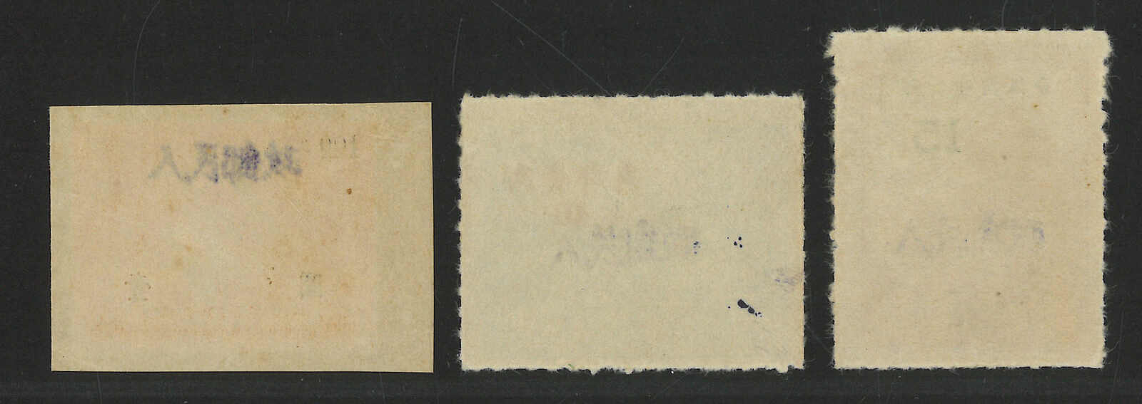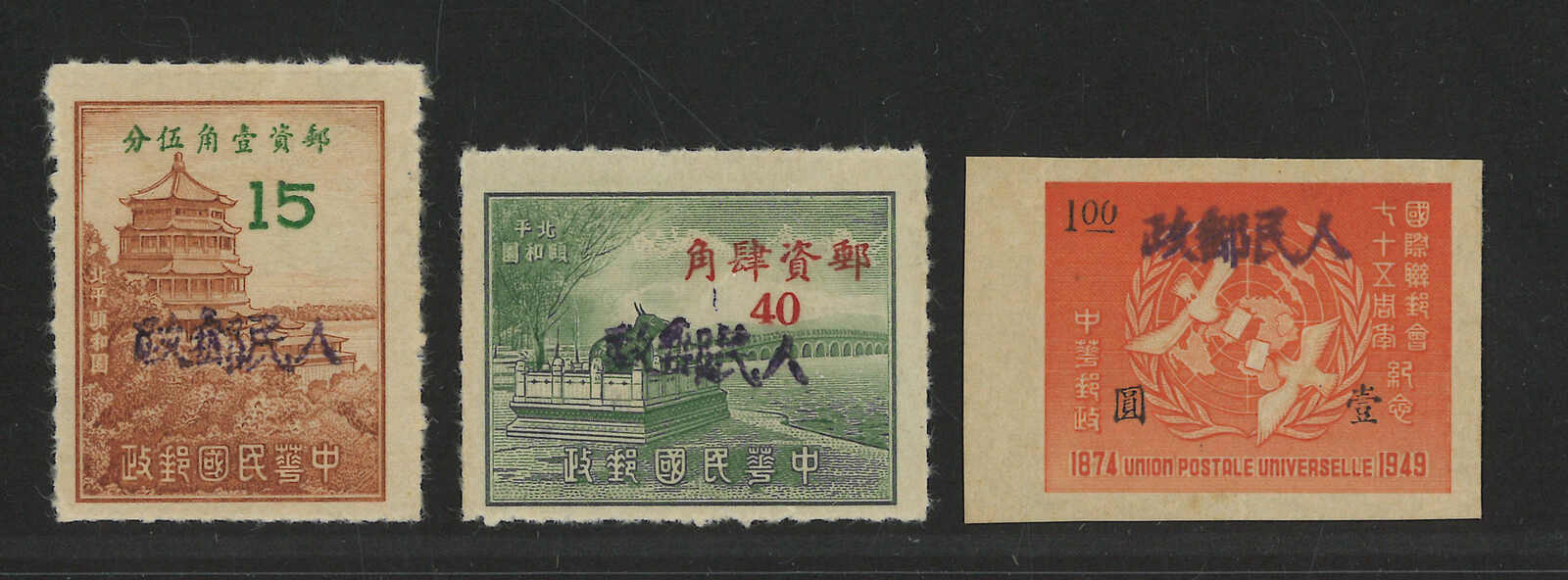 1949年新疆手蓋“人民郵政”於北平頤和園及萬國郵盟七十五週年新全(楊目NW92-94),無貼。(Image 1) (Image 2)