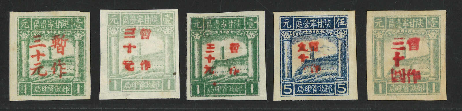 1947年陝甘寧邊區延安寶塔第一版改值票新全(楊目NW9-14),無貼。(Image 1) (Image 2)