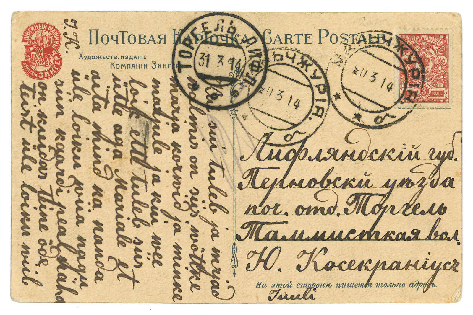 1914.3.20 圖片明信片,寄自滿洲里,貼軍徽圖3戈比,銷T&S 2型滿洲里日戳。(Image 1) (Image 2)