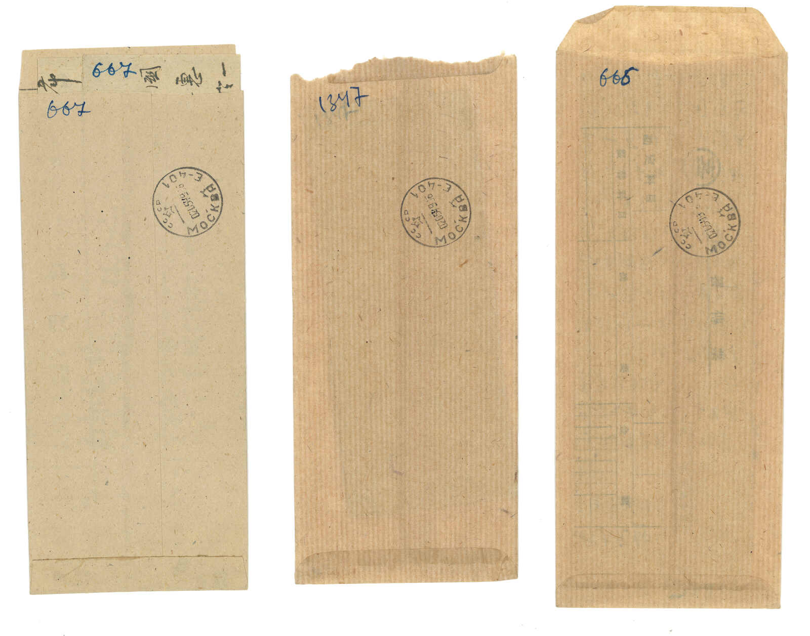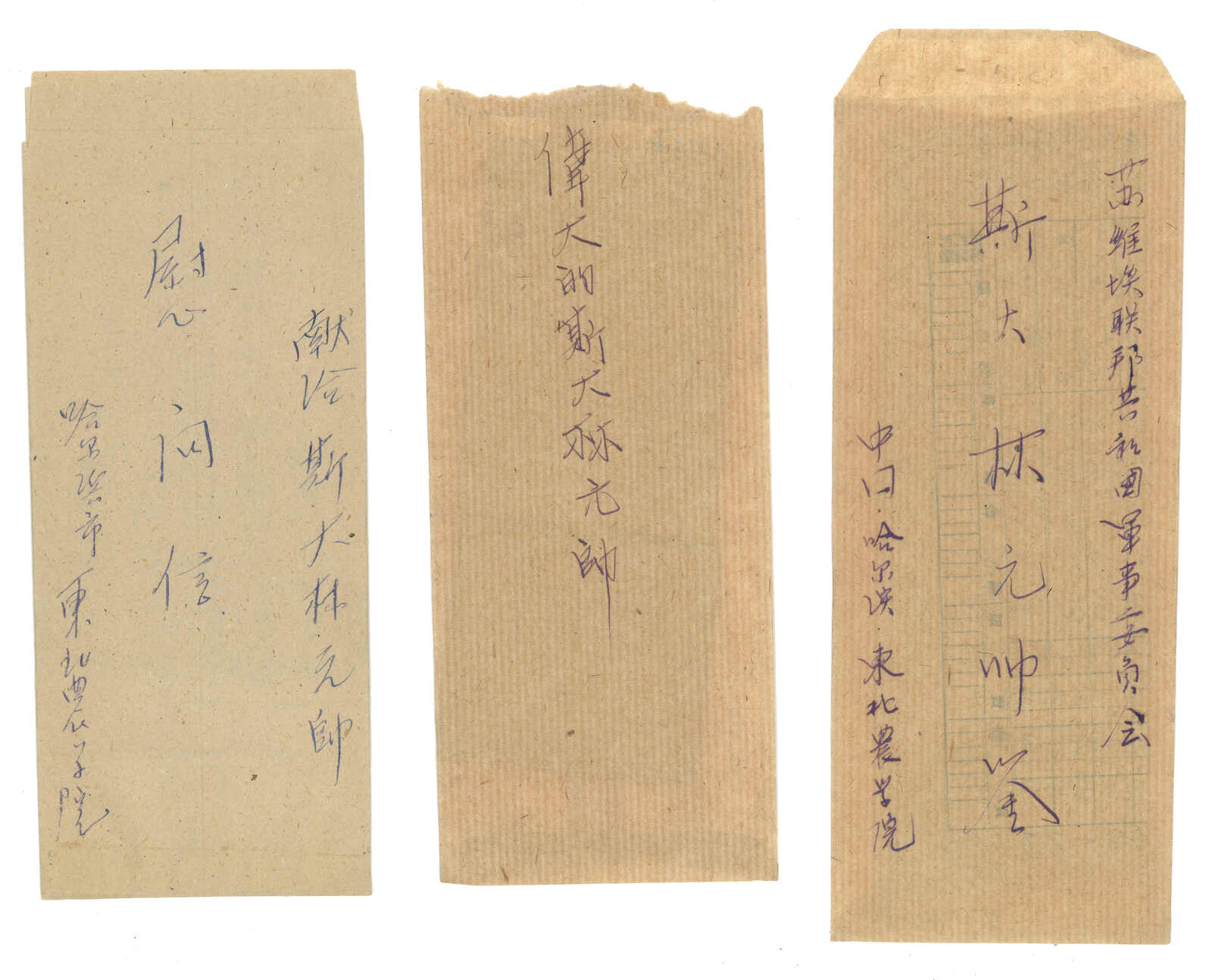 1949年一組三件哈爾濱寄斯大林之致敬信,大多寄自東北 農學院。大宗郵件無貼票,鈐莫斯科克里姆林宮E-401到達戳,地位 和北京17支相約。反映了當時對蘇聯一面倒的友好。(Image 1) (Image 2)