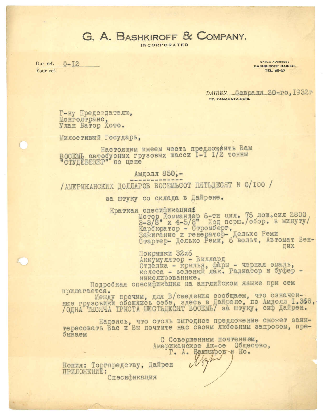 1575 image1932 a pair of G.A. Bashkiroff & Co., Harbin commerical documents. The content was about the procurement and delivery of machines.
