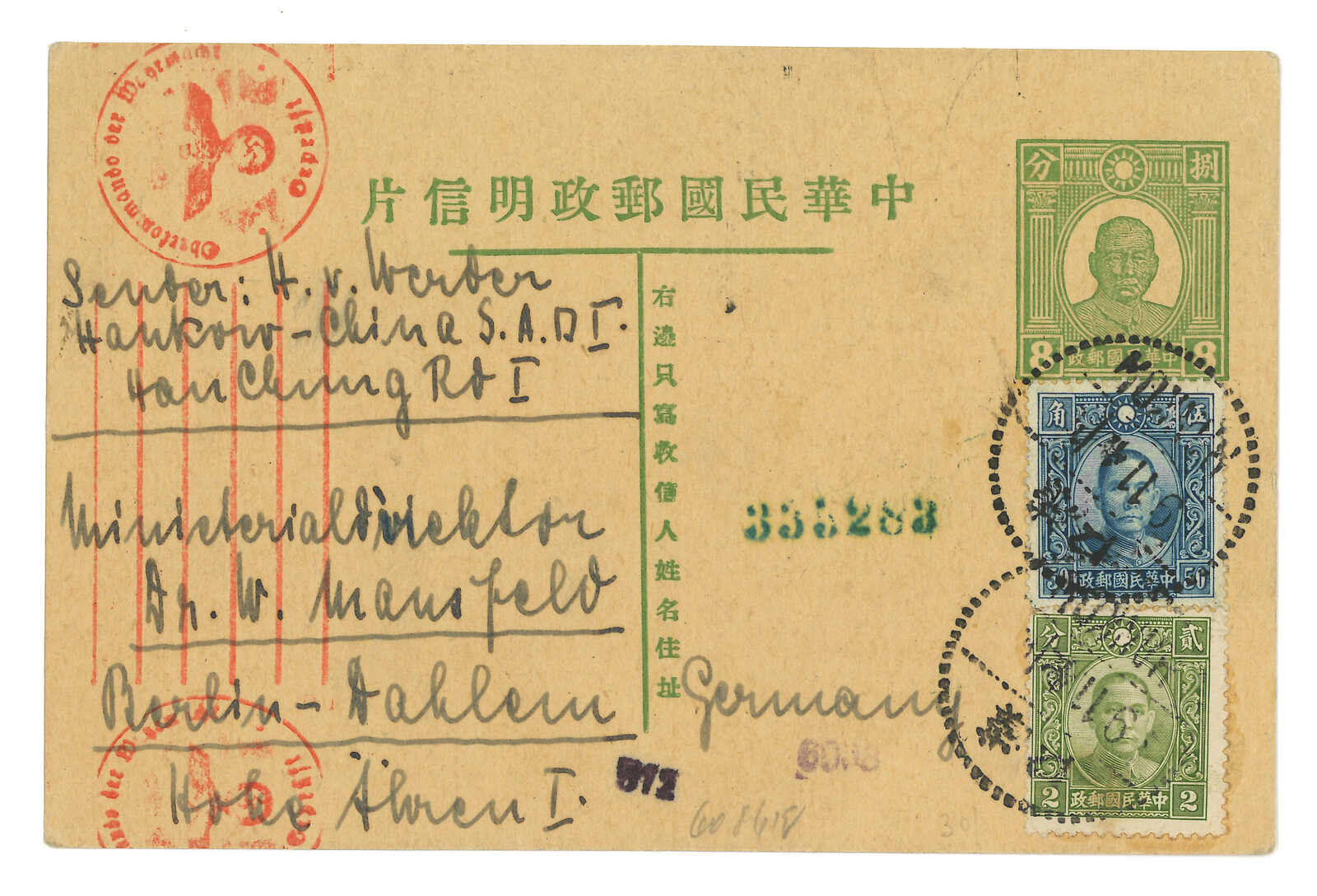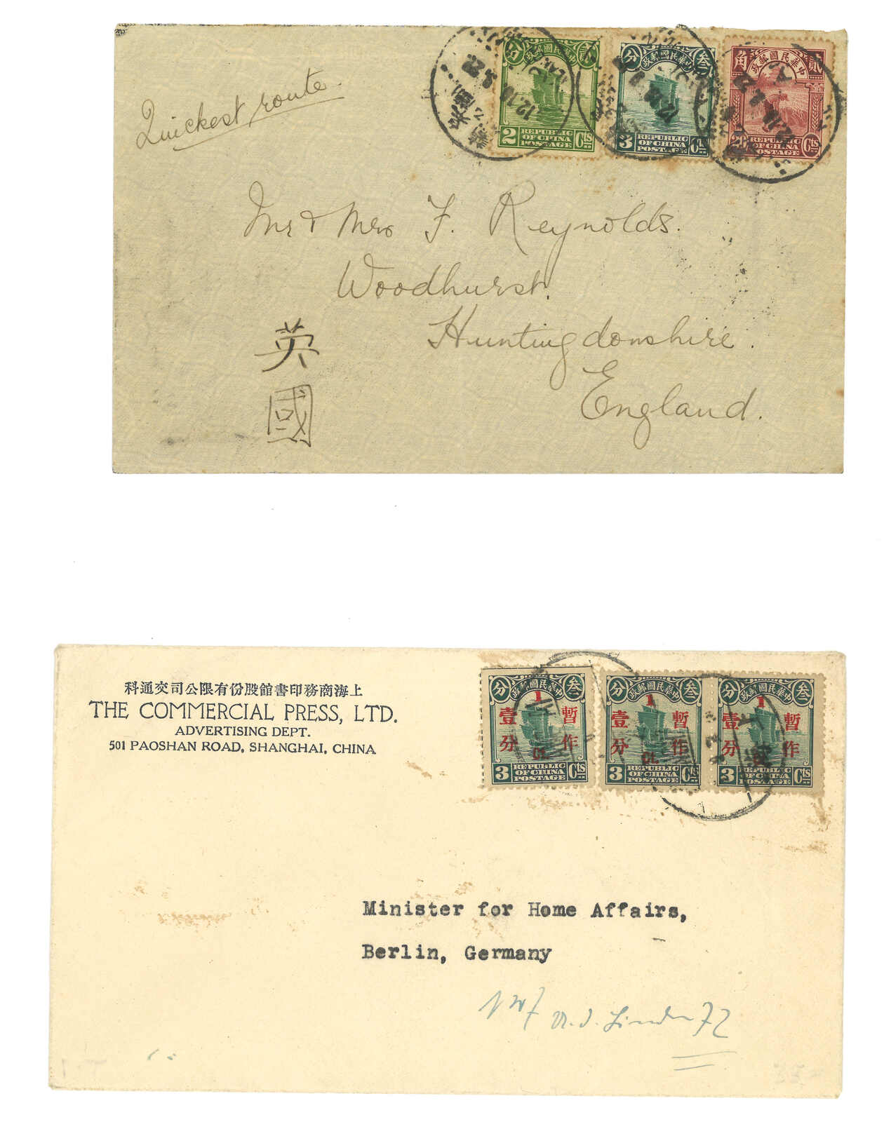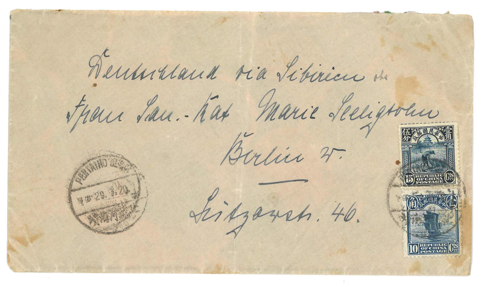 1930 Szeling (16 Jul) to Germany via Siberia, f.w. Junk x9, in total of 20c, tied by Kwantugn Szeling cds. No transit or arrival. Trans-Siberian route was interrupted by Sino-Soviet Conflict in 1929.
