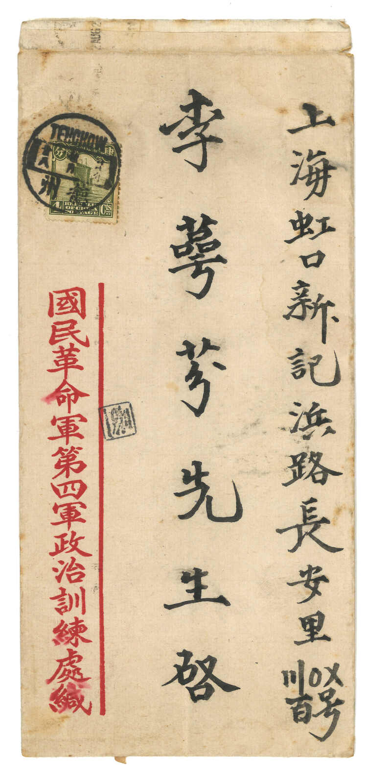 1928.7.28 國民革命軍第四軍政治訓練處寄上海,貼帆船4分,銷德州腰框英漢日戳。8.2抵上海,鈐機戳。日期為國民革命軍攻克德州後不久。(Image 1)