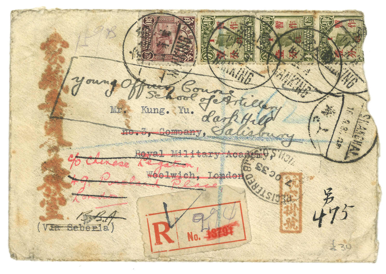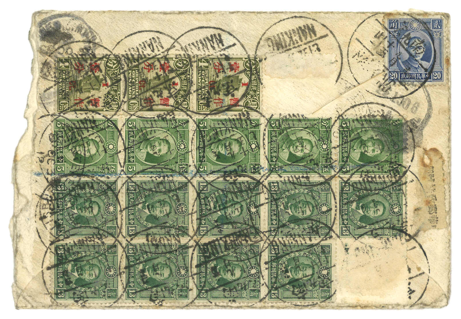 1933 Nanking (15 Sep) to England. Airmail registered cover, f.w. Junk, SYS and Martyrs x22 + 2 dropped stamp on both sides, tied by Nanking bilingual cds. Transit Shanghai (16 Mar). Arrived England (7 Oct). Nice large