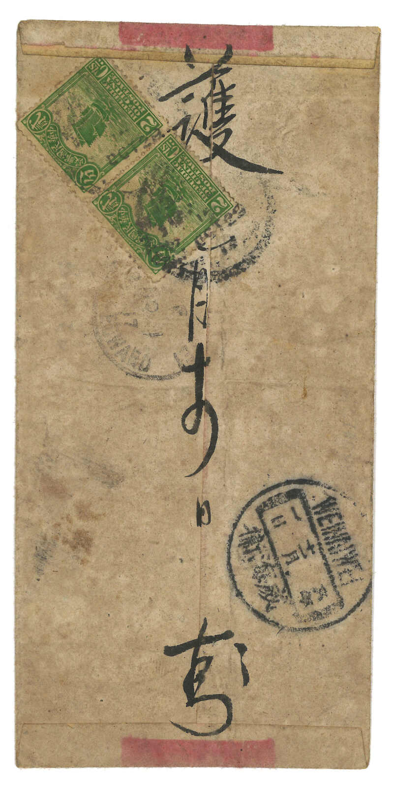 1917 Tientsin (29 (Oct) to Weihaiwei. Red band cover, f.w. Junk 2c in pair onr reverse, tied by Tientsin bilingual cds. Transit Weihaiwei Chinese PO (1 Nov) with scarce bilingual cds. Arrived Weihaiwei BPO (1 Nov). Scarce.