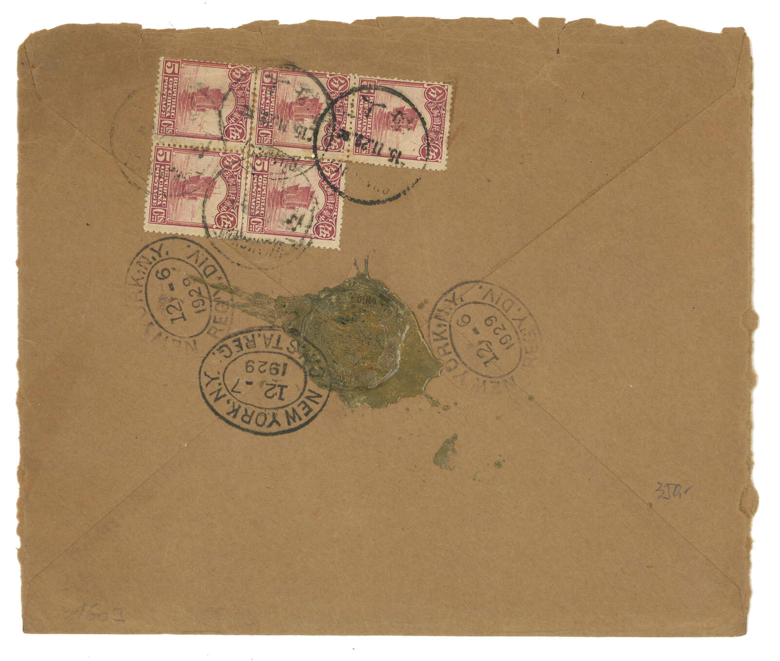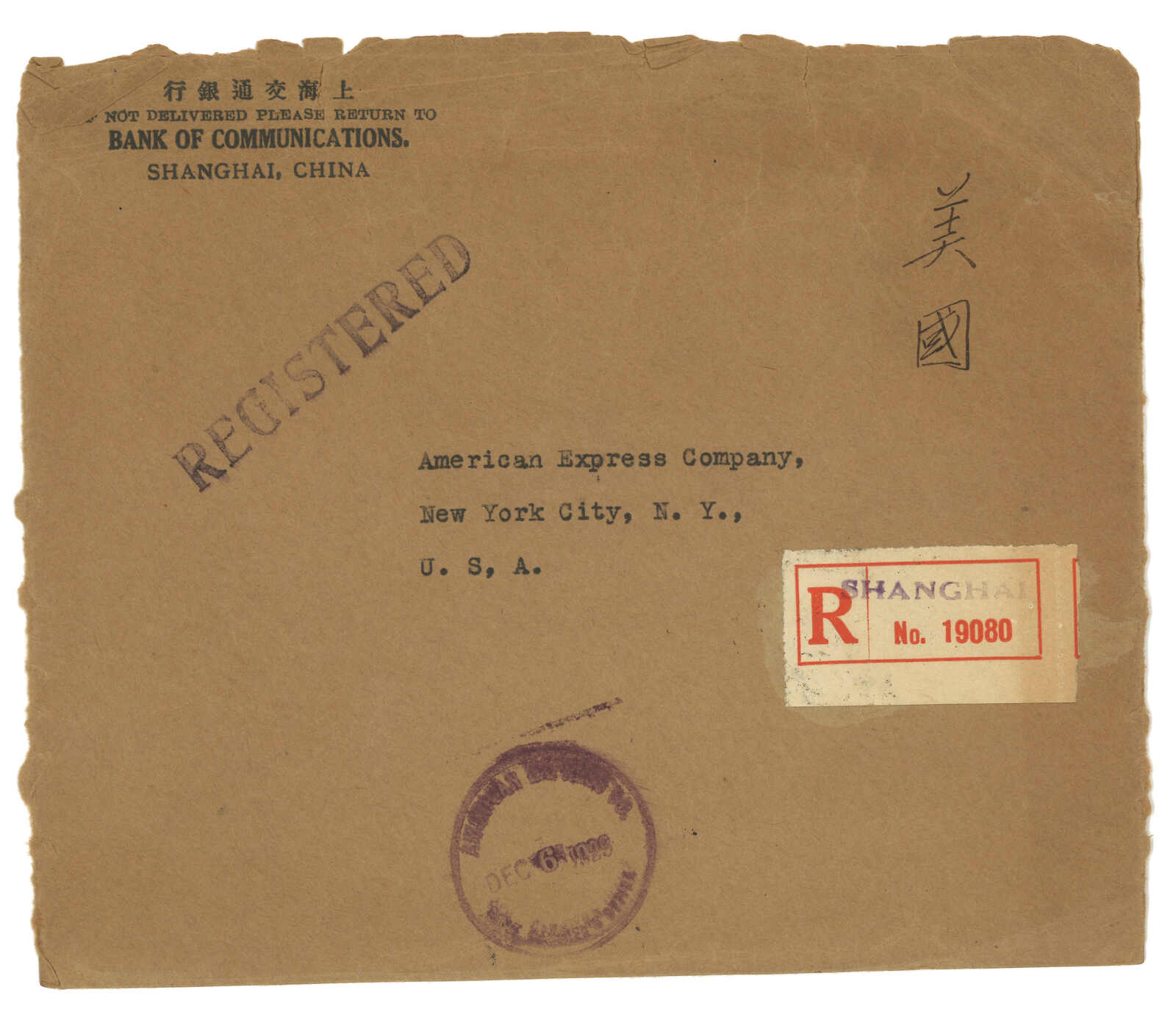1929 Shanghai (13 Nov) to USA. Bank of Communications registered cover, f.w. Junk 5c in block of 5 on reverse, tied by Shanghai bilingual cds. Arrived USA (6 Dec)