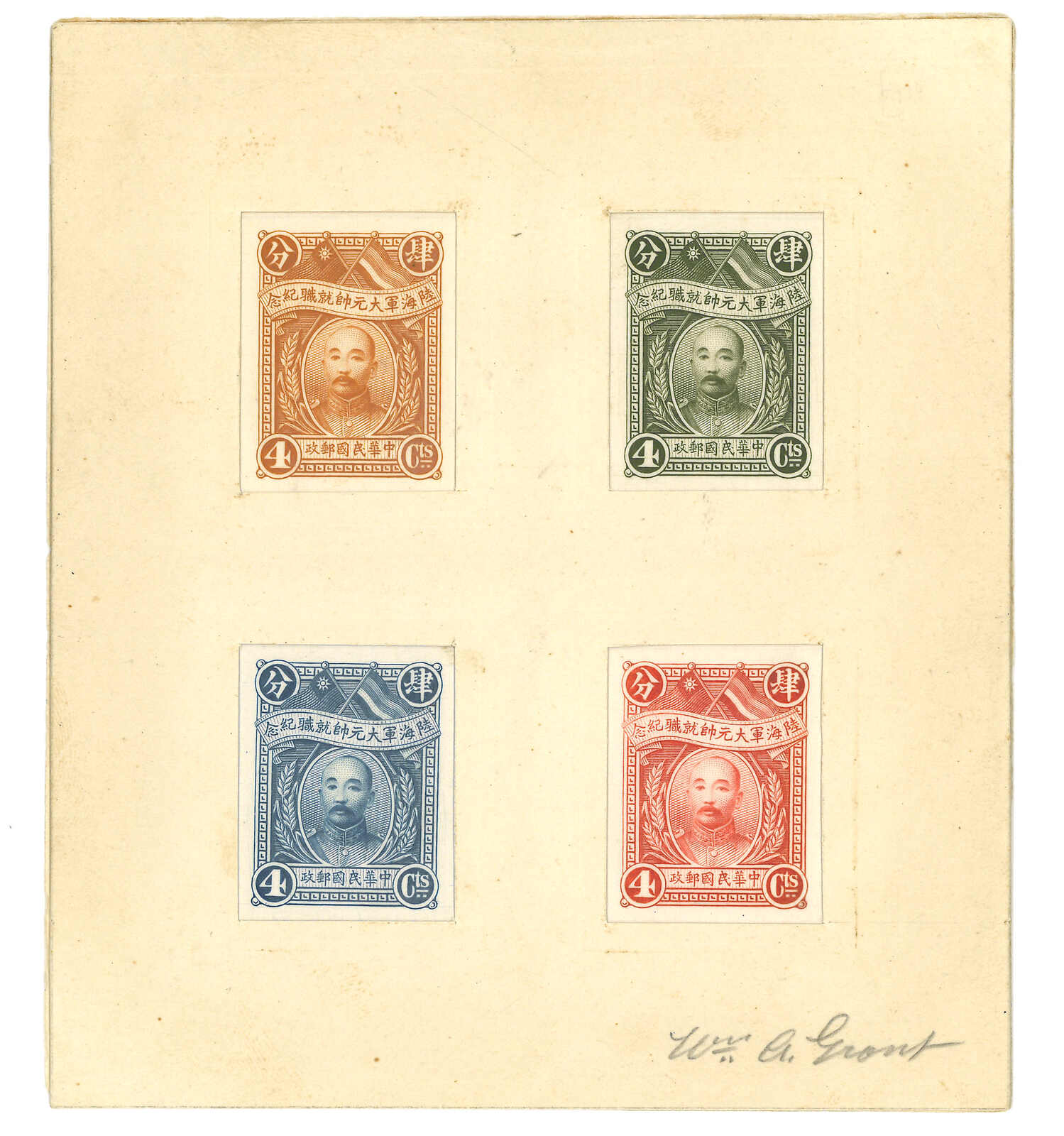 1928年大元帥就職紀念票全無齒試印張全(陳目293-296),帶有設計師兼雕刻師W.A.Grant 簽名。(Image 1)