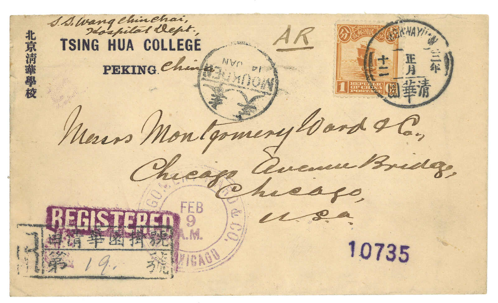 1914 Tsinghwayuan (12 Dec) to USA. Tsing Hua College cover, f.w. Junk 1c on front and 1c x8 + 3c x7 on reverse, in total of 30c, tied by Tsinghwayuan bilingual cds, matching with registered mark. Transit Moukden (14 Jan).