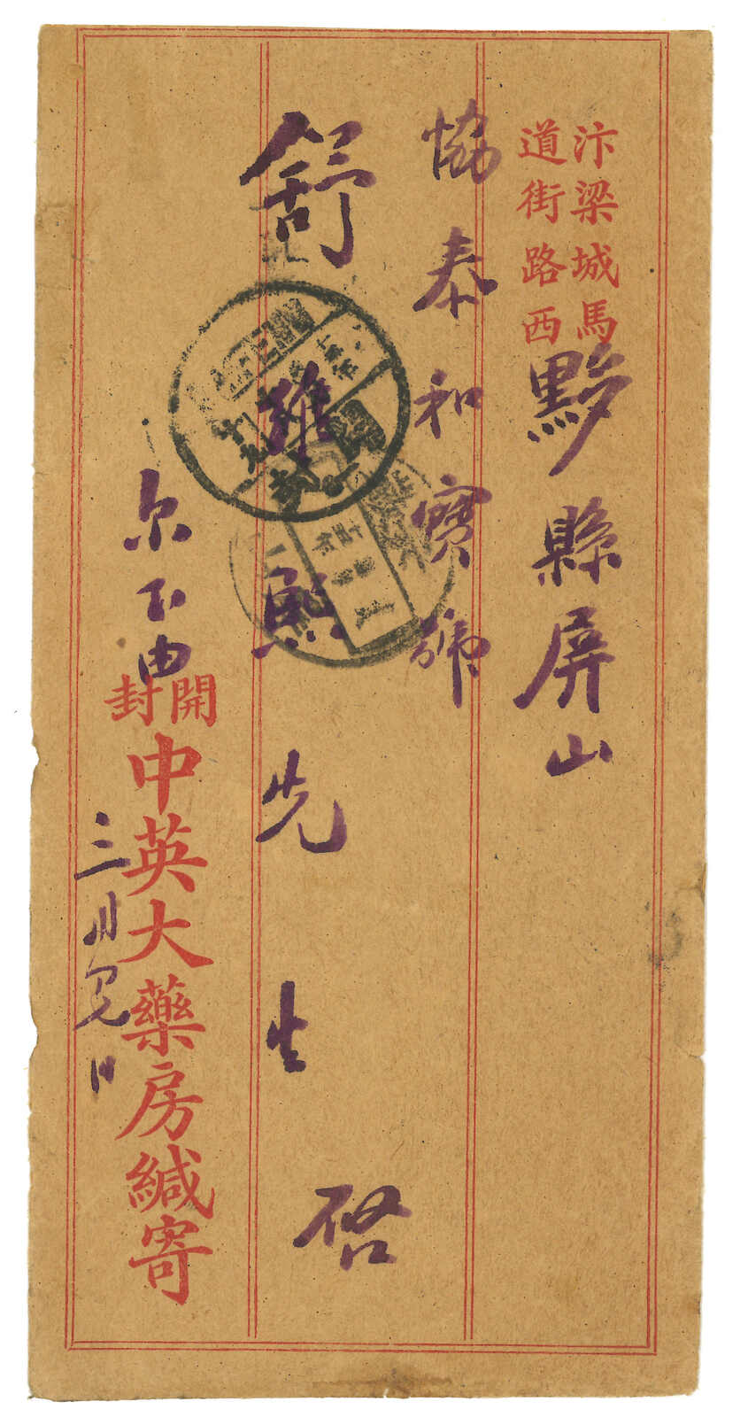 1926 Kaifeng (18 Apr) to Ihsine. Chinese style cover from a pharmacy, applied with "Kaifengfu mail box No. 22" circular seal on reverse. F.w. Junk 1c + 3c, tied by Kaifeng bilingual cds. Transit Tatung (23 Apr). Arrived Ihsien