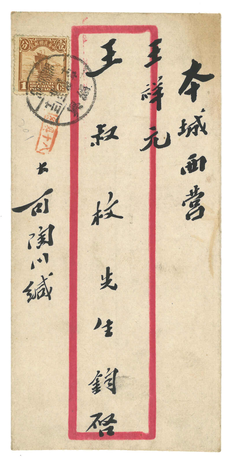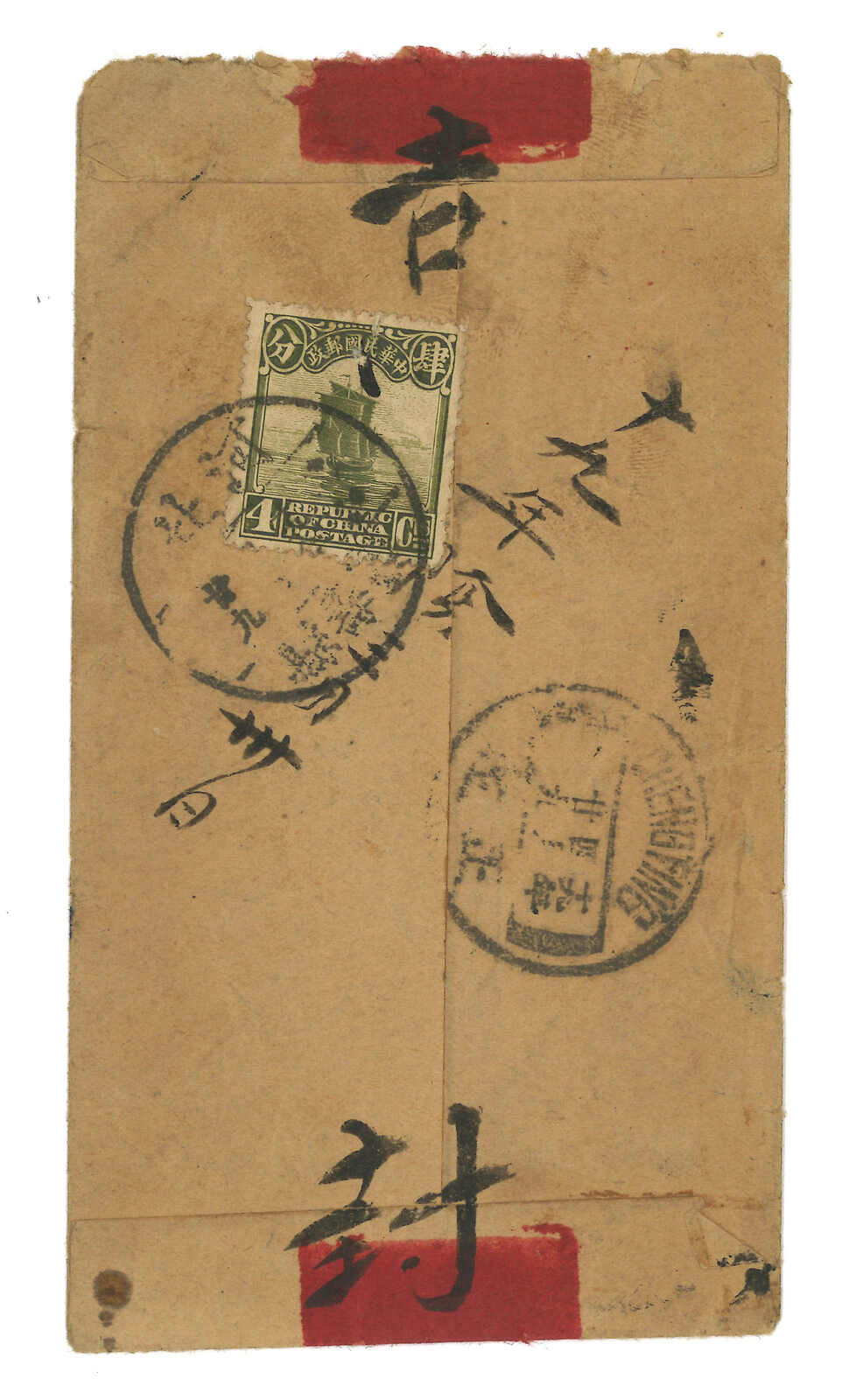 1930 Ningshow (29 Apr) to Sinhsien. Red band cover, f.w. Junk 4c on reverse, tied by Hopeh Ningshowhsien cds. Transit Chengting (29 Apr). 2001 (Jun) John Bull.