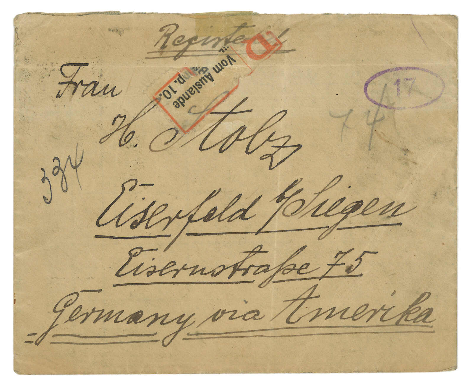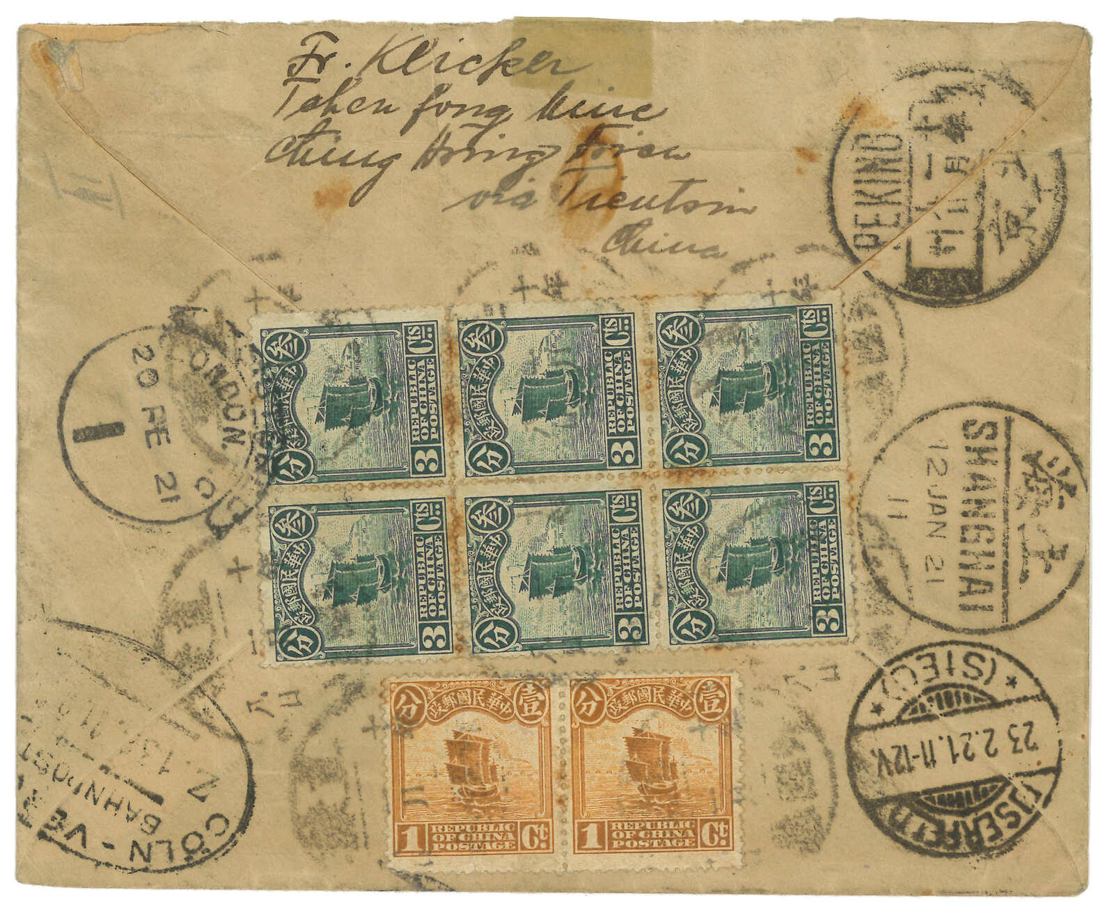 1921 Chihli to Germany via USA. Registered cover, f.w. Junk 1c in pair + 3c in block of 6, in total of 20c, tied by faint Chihli cds. Transit Peking (9 Jan), Shanghai (12 Jan), London (20 Feb). Arrived Germany (23 Feb). Trans