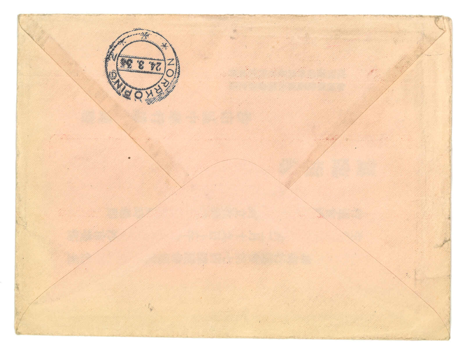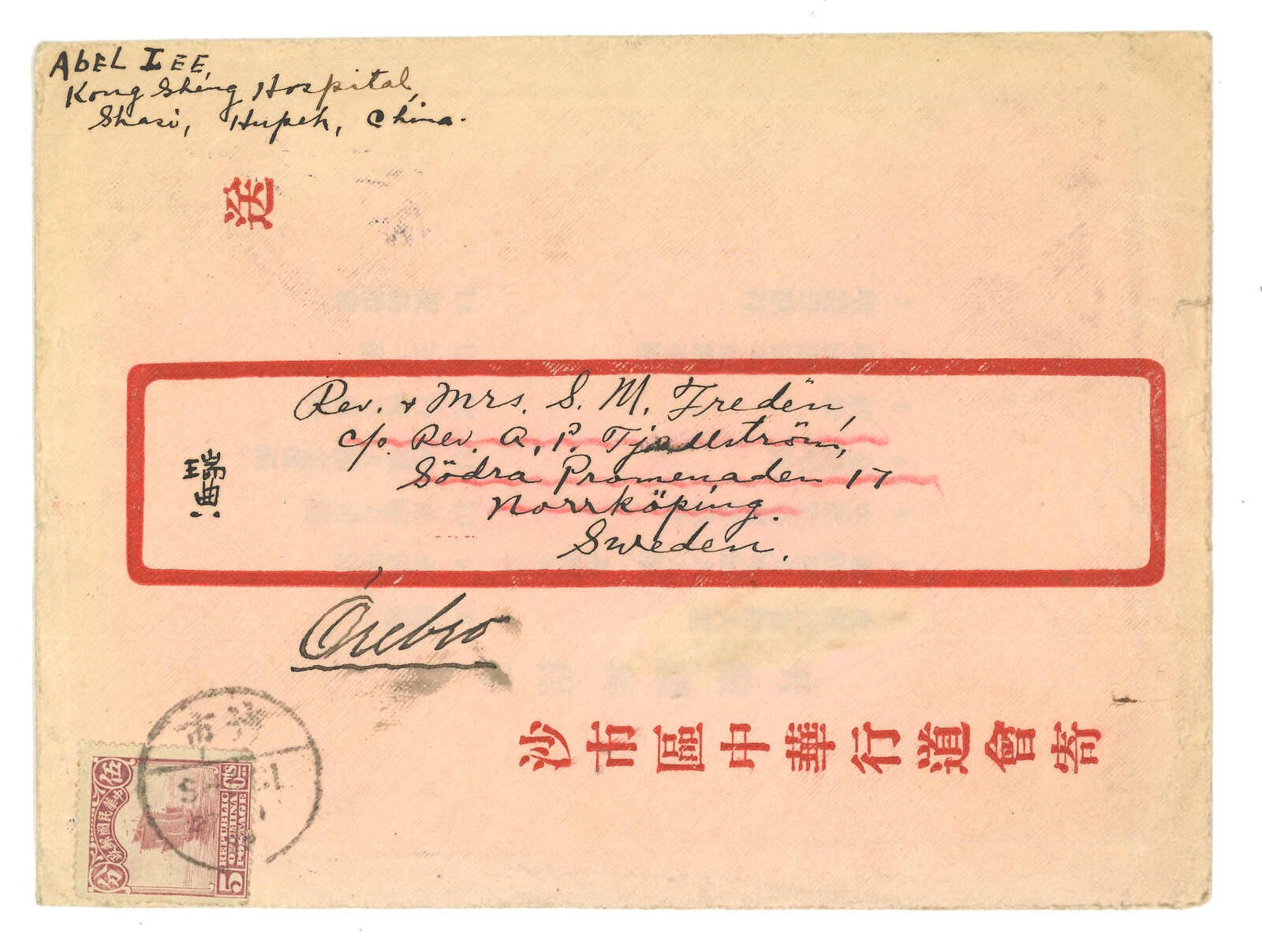 1933年中國內地會封自沙市寄瑞典,貼帆船5分合印刷品郵資,銷沙市半切漢英日戳。3.24抵Norrkoping。(Image 1)