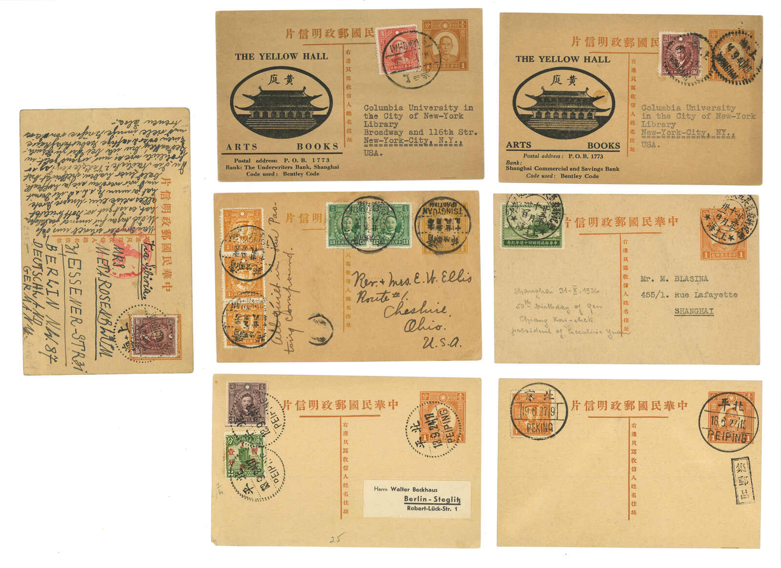 1930至1940年代一組七件孫像第一版1分郵資片(韓目41),包括寄國內外實寄及集郵例子。部分鈐蔣委員長誕辰紀念戳。當中一件日期為1935年3月13日,為較早之例子。(Image 1)