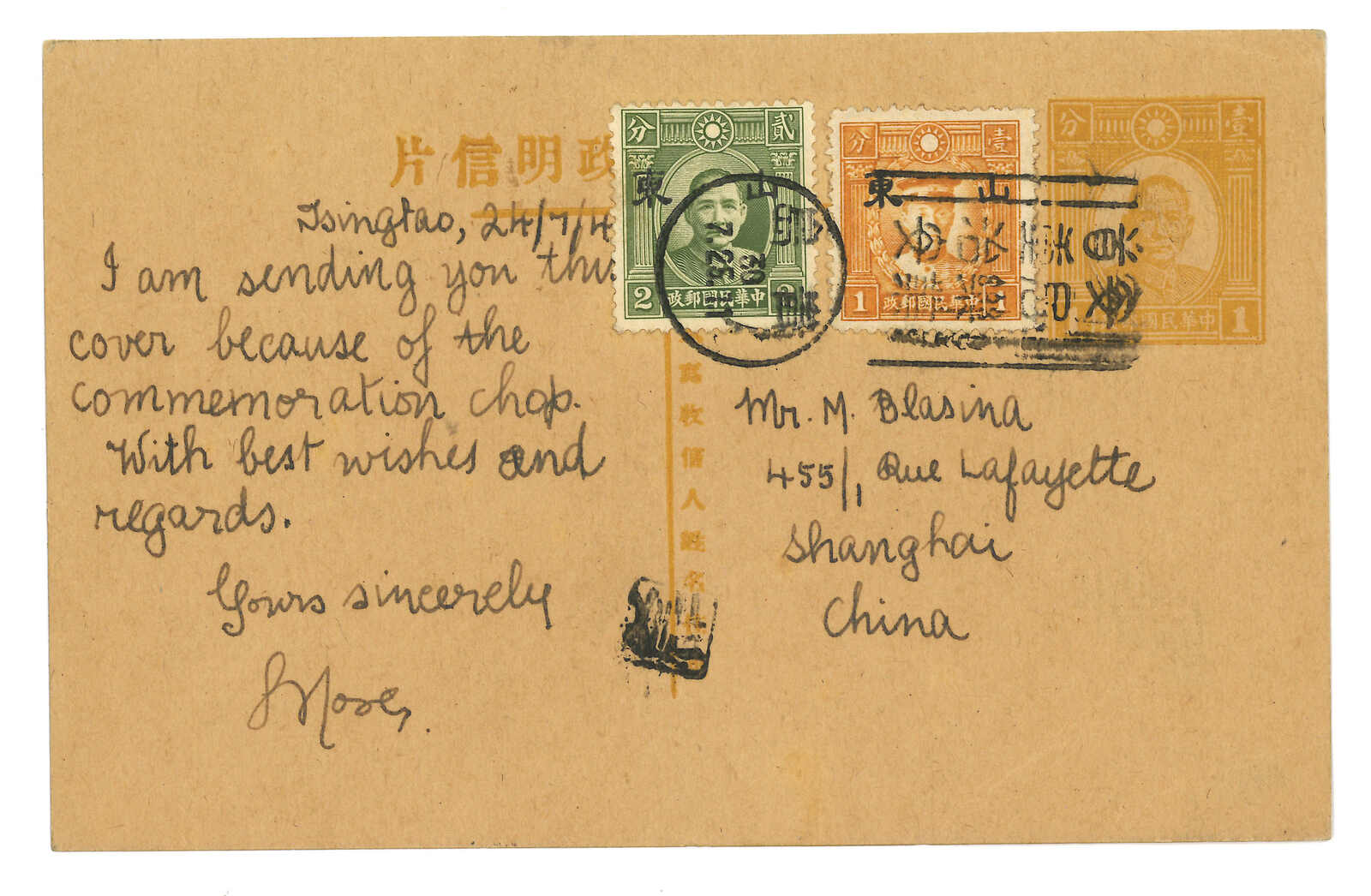 青島寄上海。孫像第一版1分郵資片(韓目41),加貼烈士2分 + 孫像1分加蓋小字′山東”,銷青島政治宣傳機戳。7.27抵上海。(Image 1)