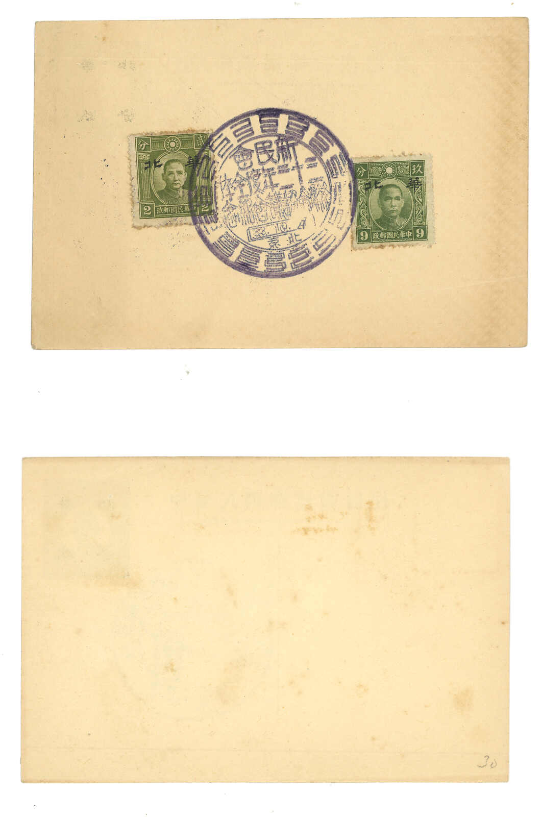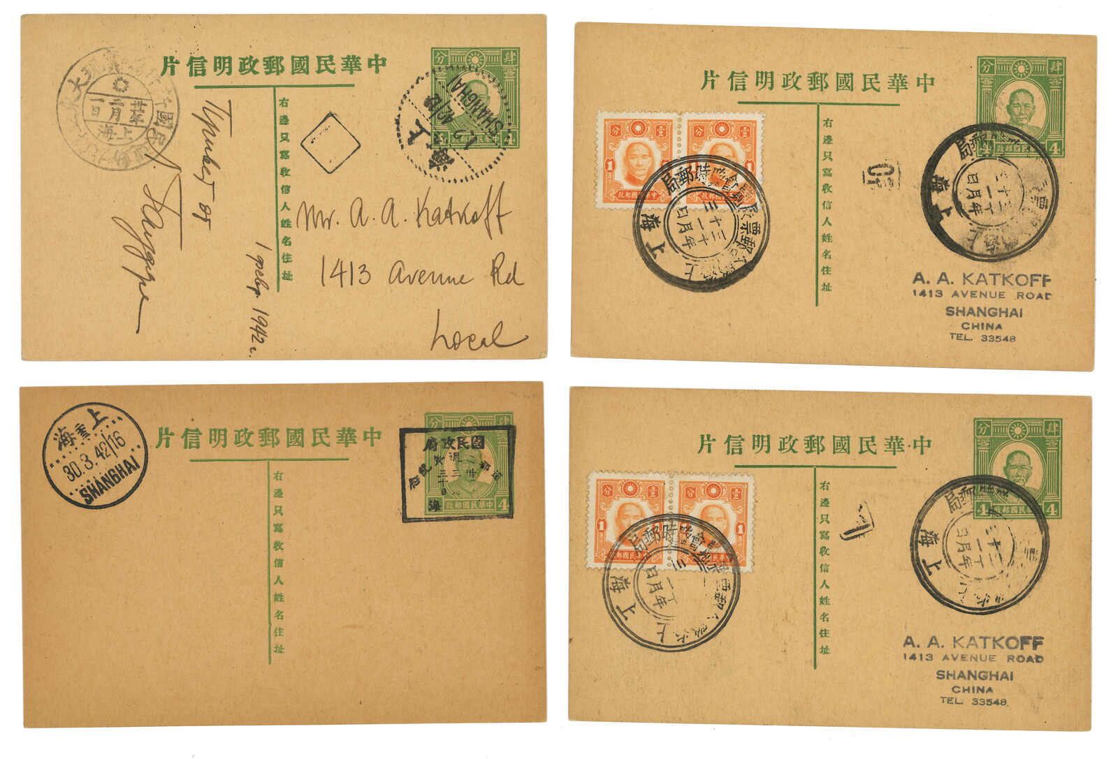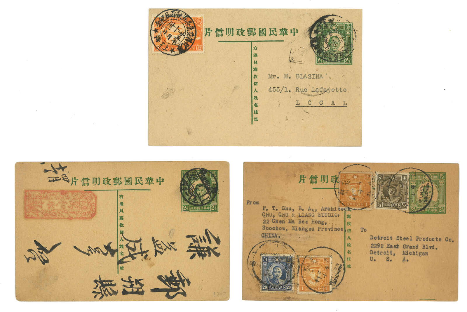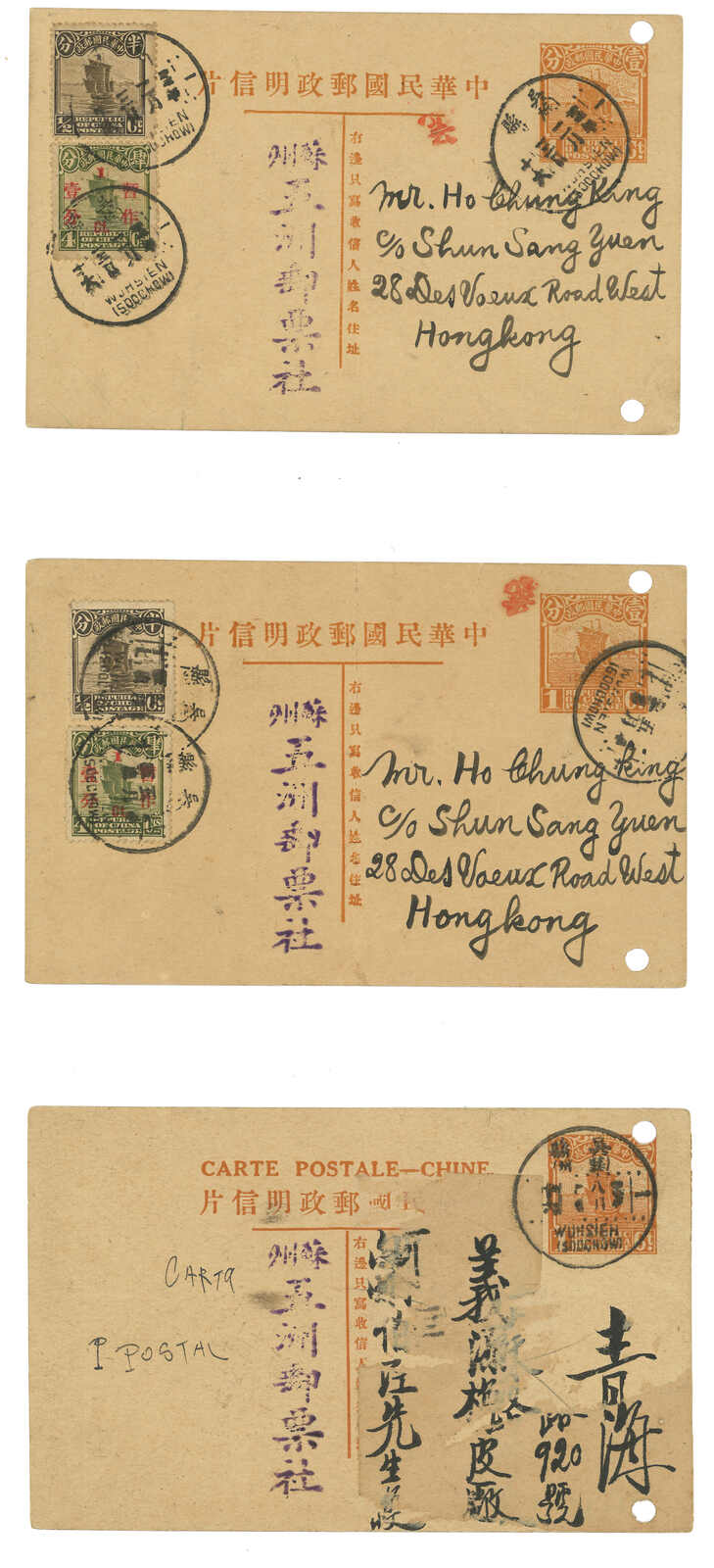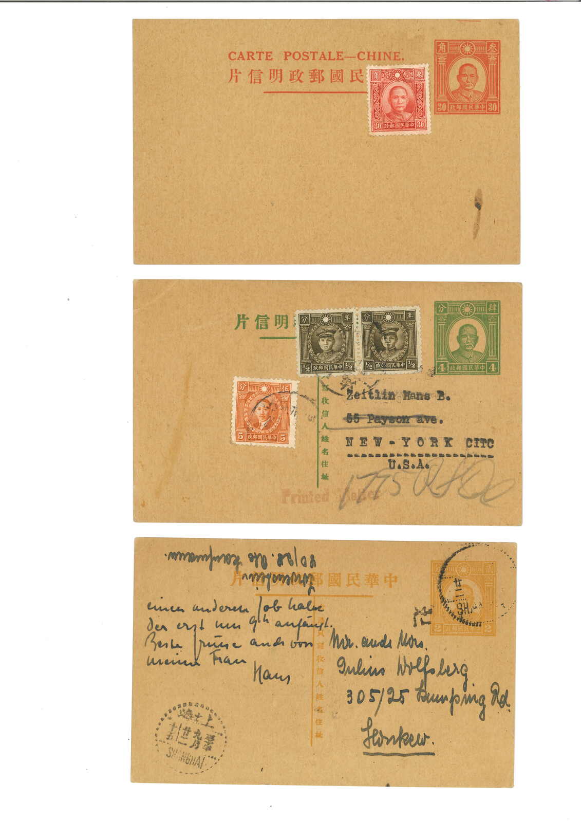 1940 a group of 3 SYS 2nd print 2c, 4c and 30c PSC (Han 49-51). 2c and 4c commercially used from Shanghai to Hankow and USA respectively. 30c card uprated with SYS 30c stamp but uncancelled. 30c card is especially scarce.