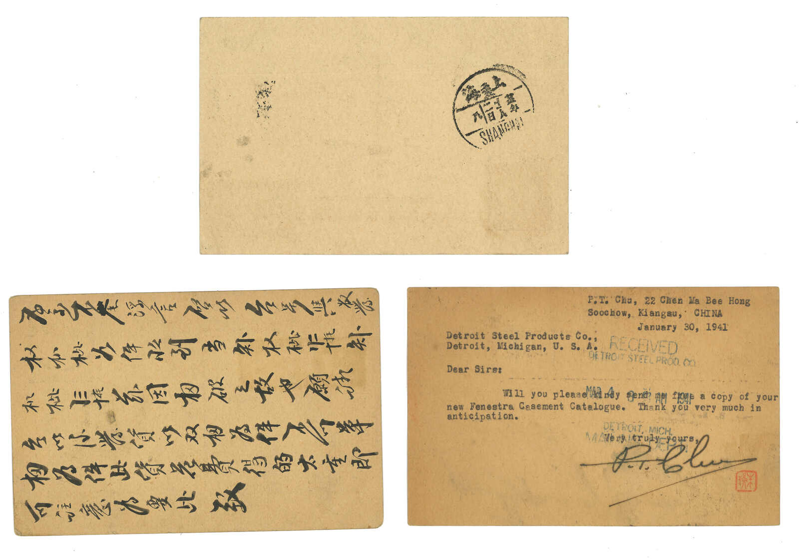 1940年代一組三件孫像第二版2分、4分及3角郵資片(韓目49-51),當中2分及4分片分別自上海寄漢口及美國。3角片加貼孫像3角票但未使用。3角片尤其少見難得。(Image 1)