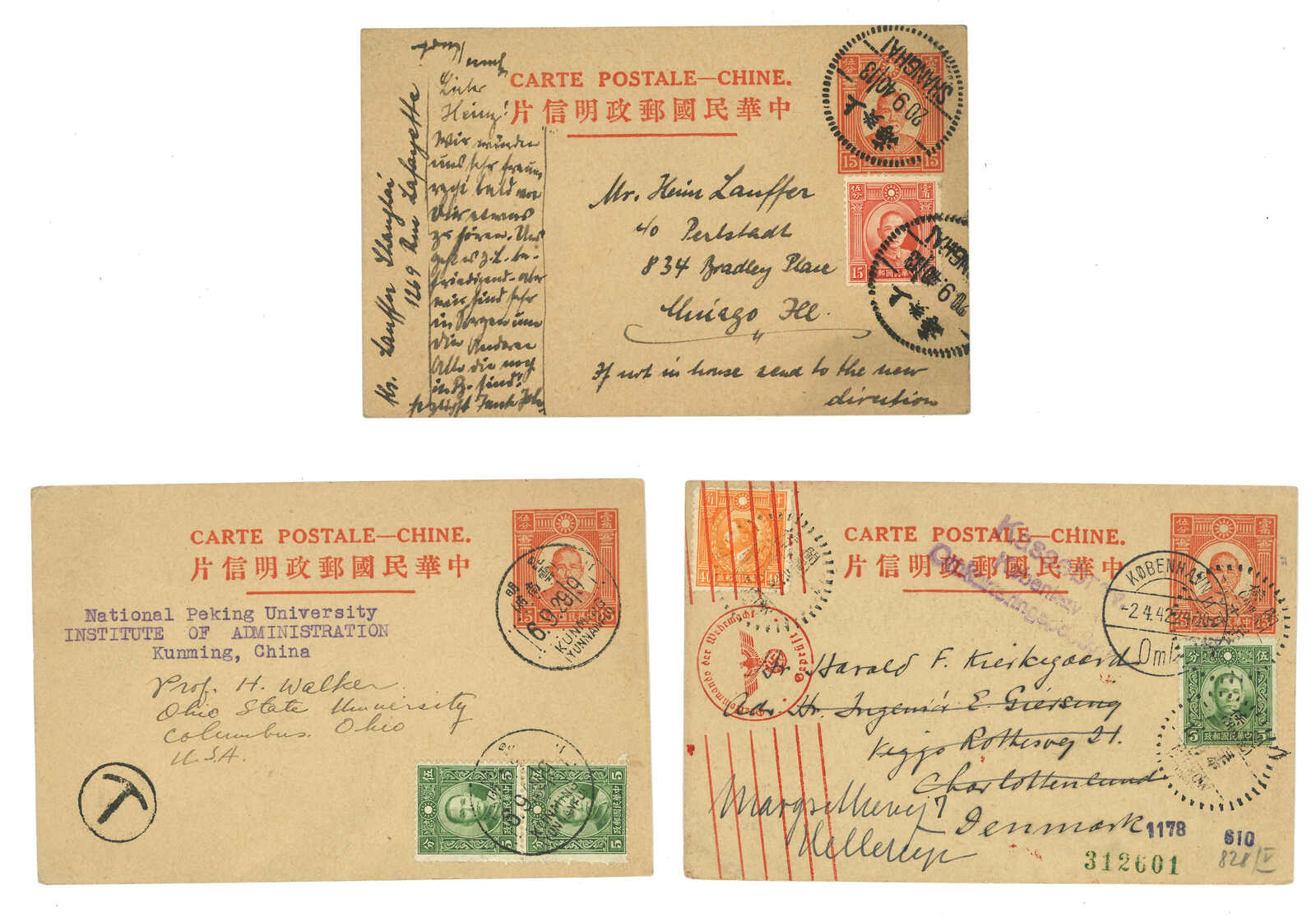 1940-1942 a group of 3 SYS 1st print 15c PSC (Han 47), all commerically used from Kunming, Minhow and Shanghai to USA. Rather late examples, not to mention sending from Yunnan.