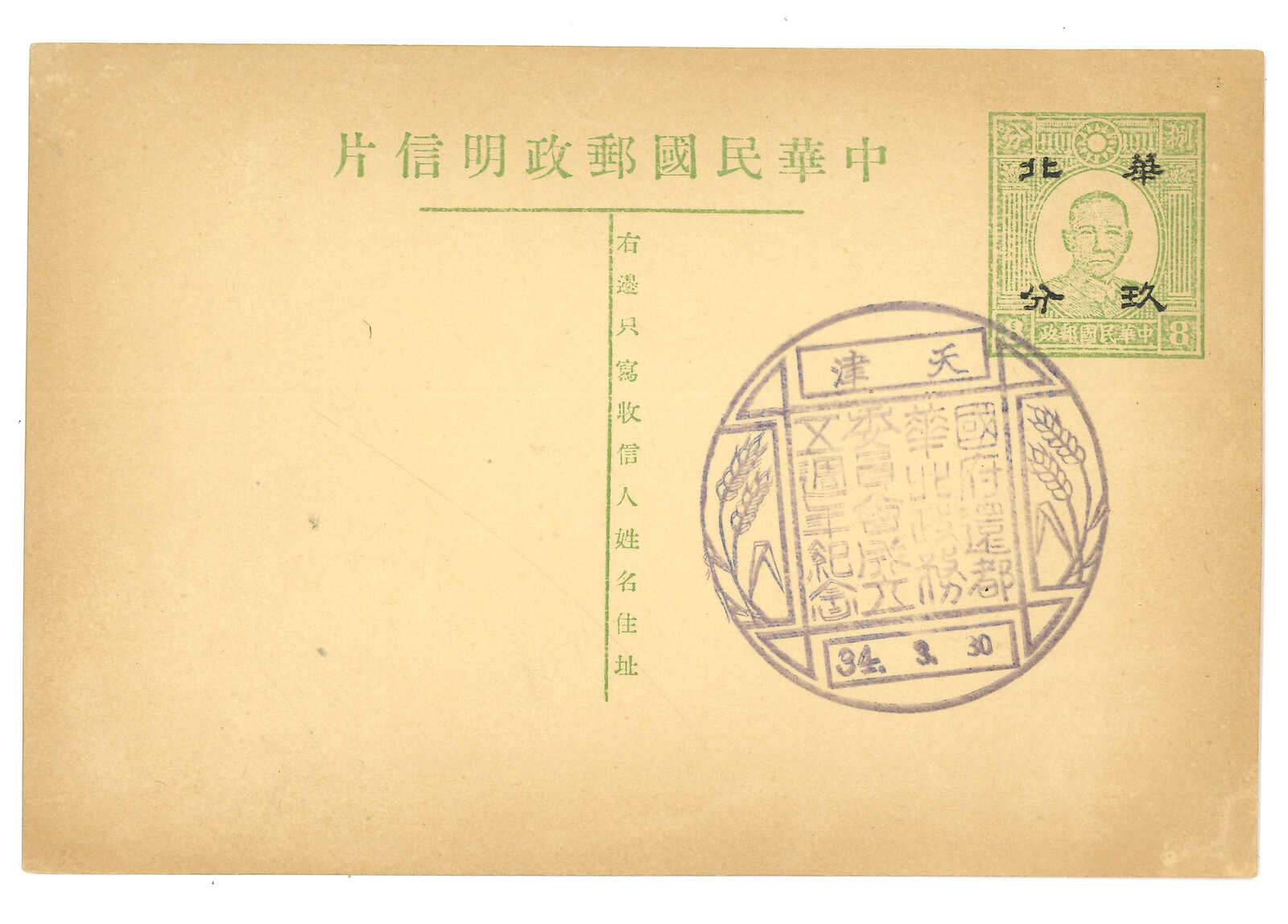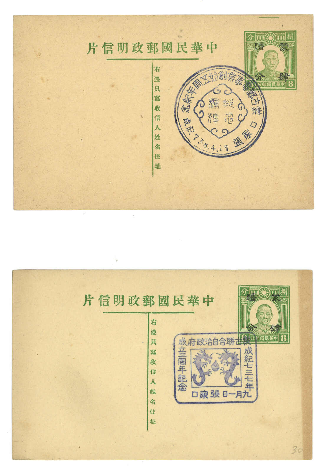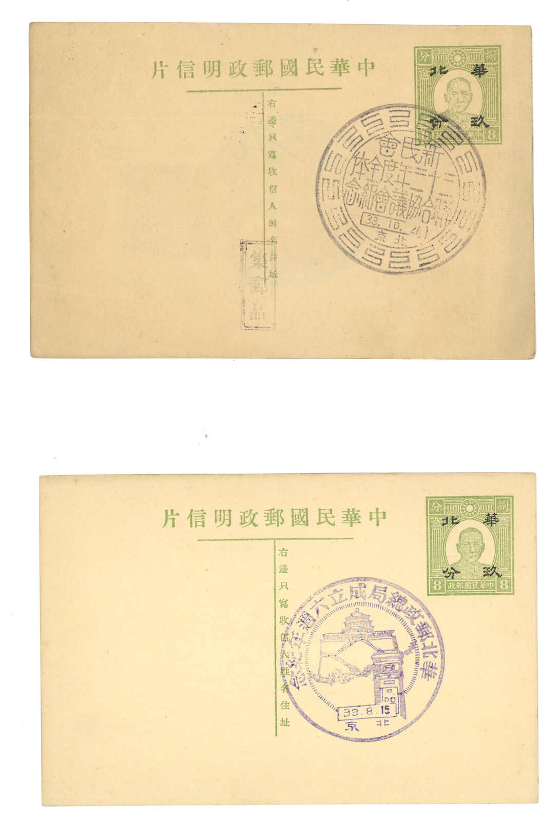1940年代一組四件華北及蒙疆半值孫像郵資片,均鈐紀念日戳,如“華北郵政總局六週年”、“蒙古郵電事業五週年”等。(Image 1)