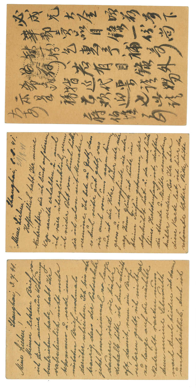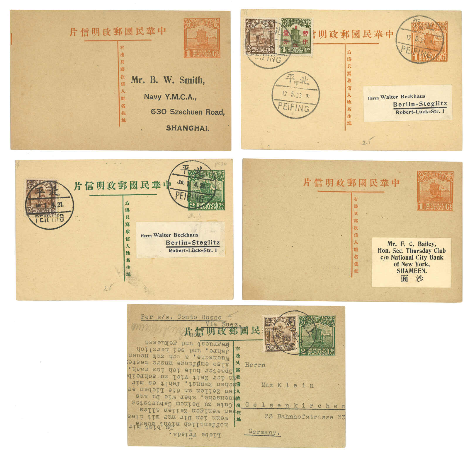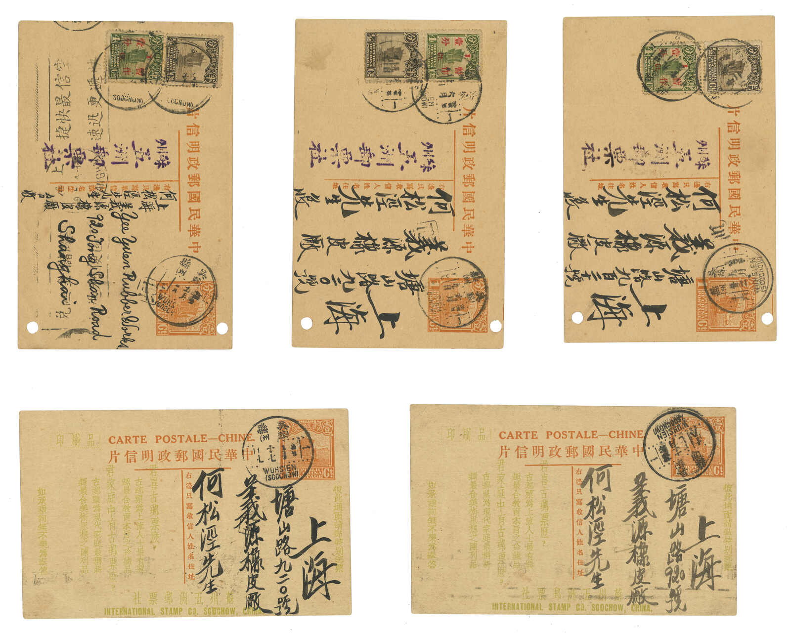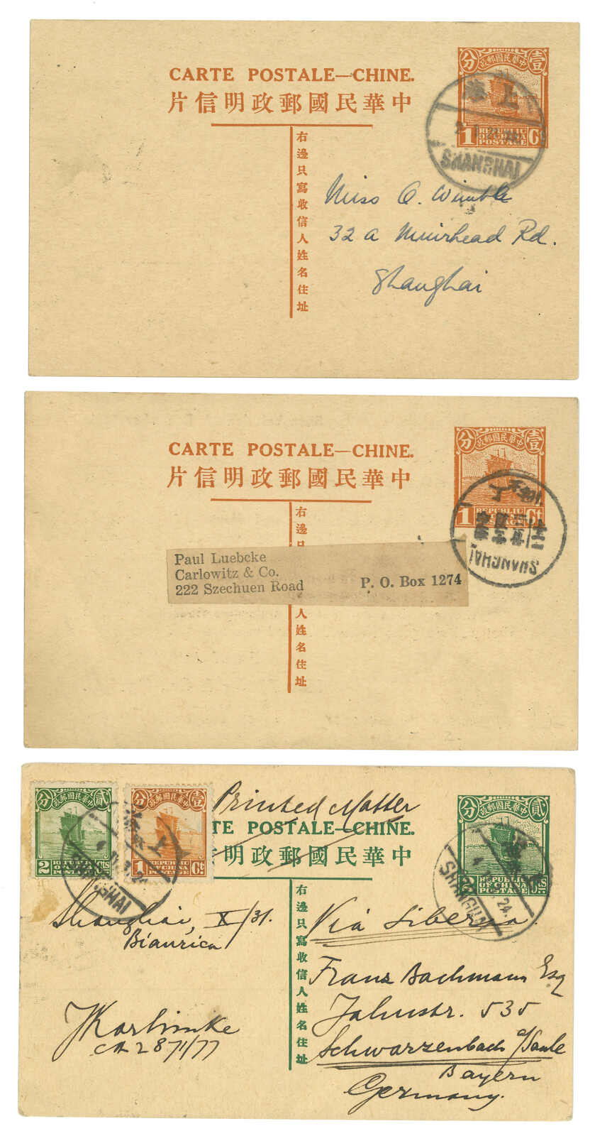 1930-31 a group of 3 Junk 6th print 1c and 2c PSC (Han 30-31), all commerically used in Shanghai local or from Shanghai to Germany. The issuance of Junk 6th print PSC is short.