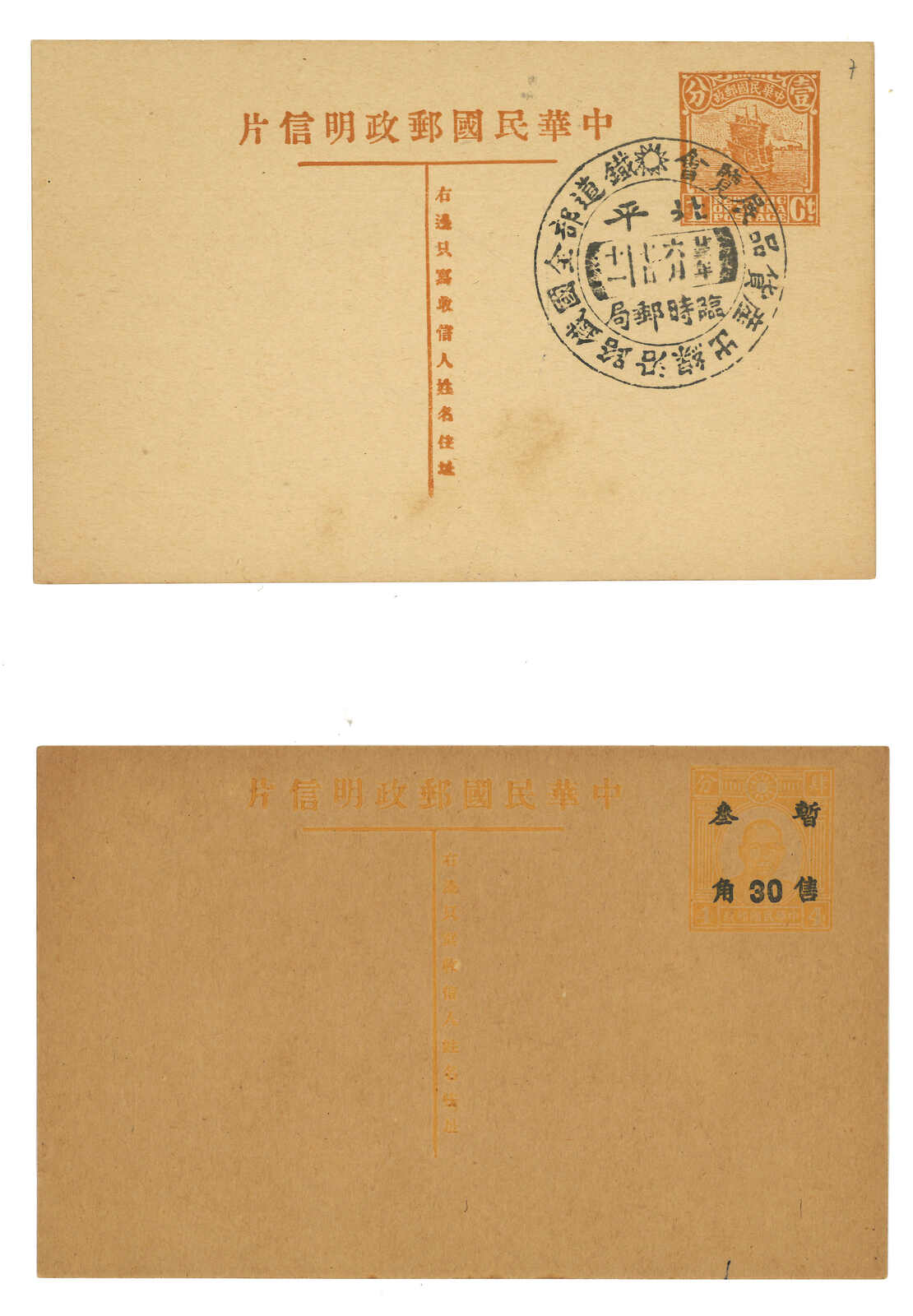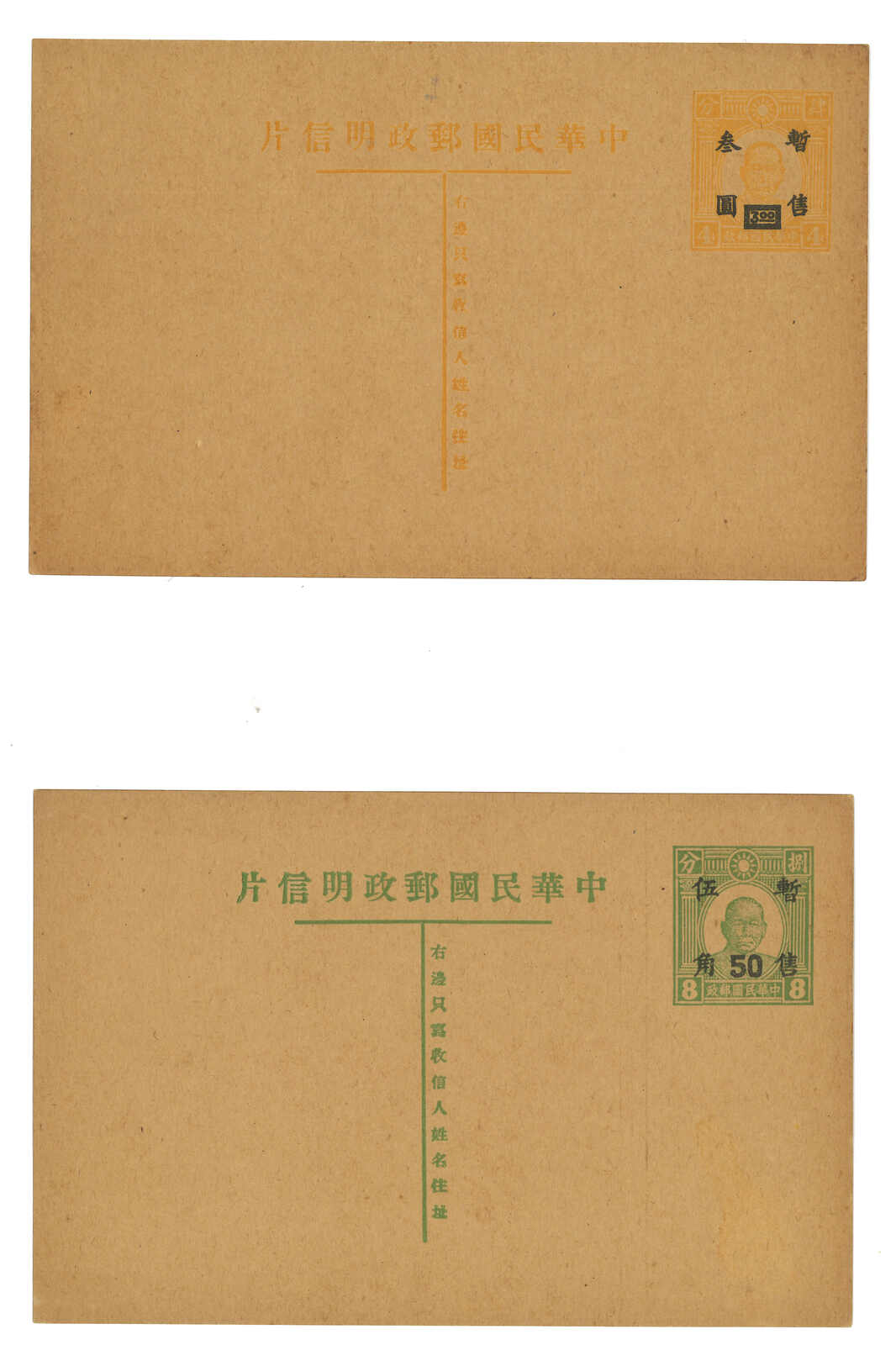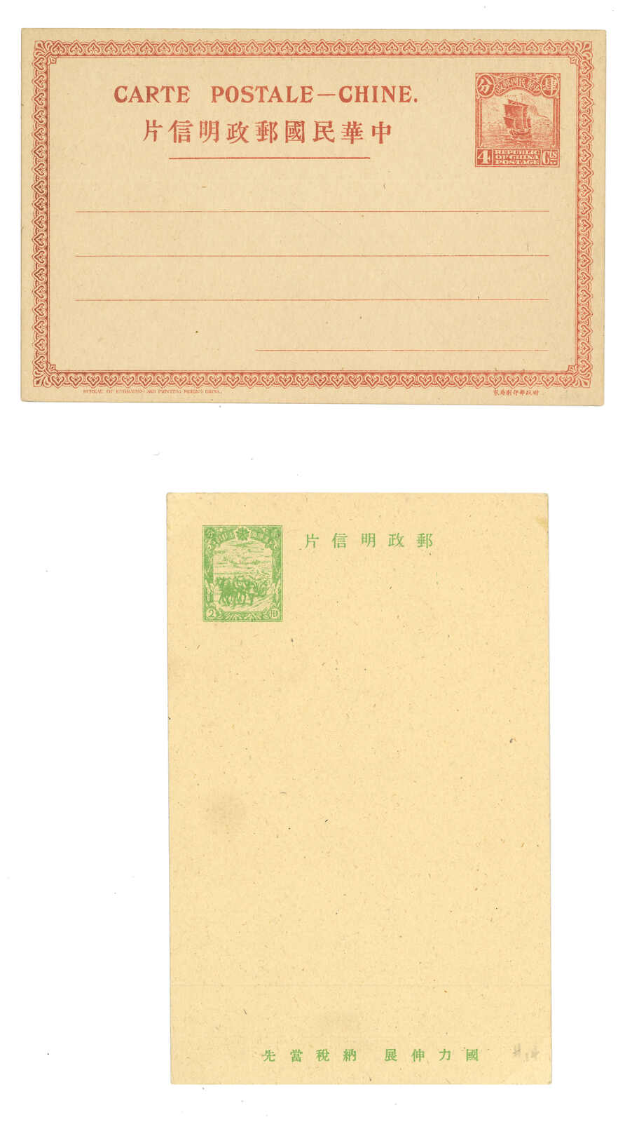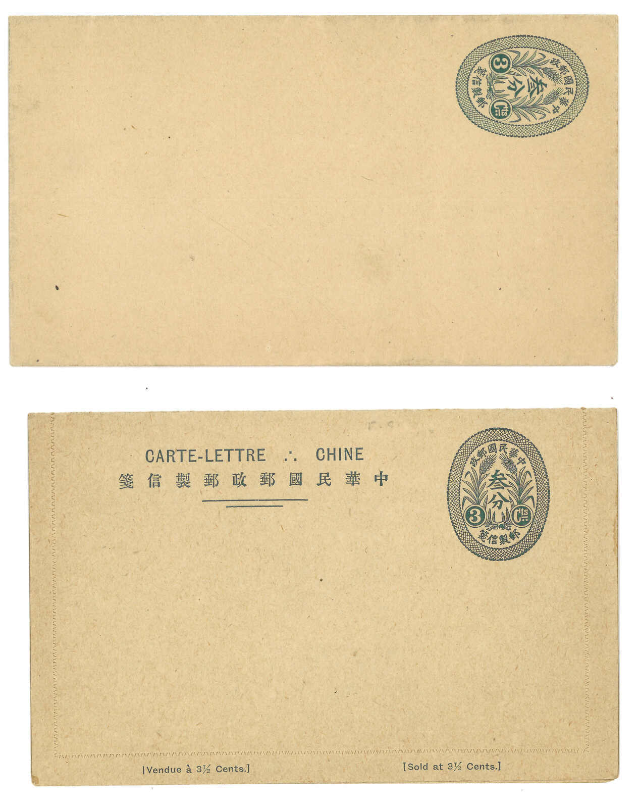 1918 ROC Post vertical type 3c and horizontal type 3-1/2c letter card (Han 6-7), both unused. Very Fine.