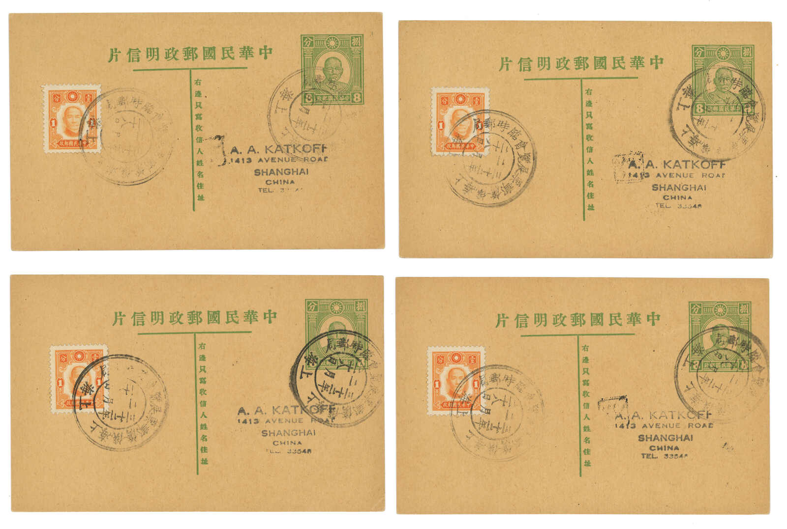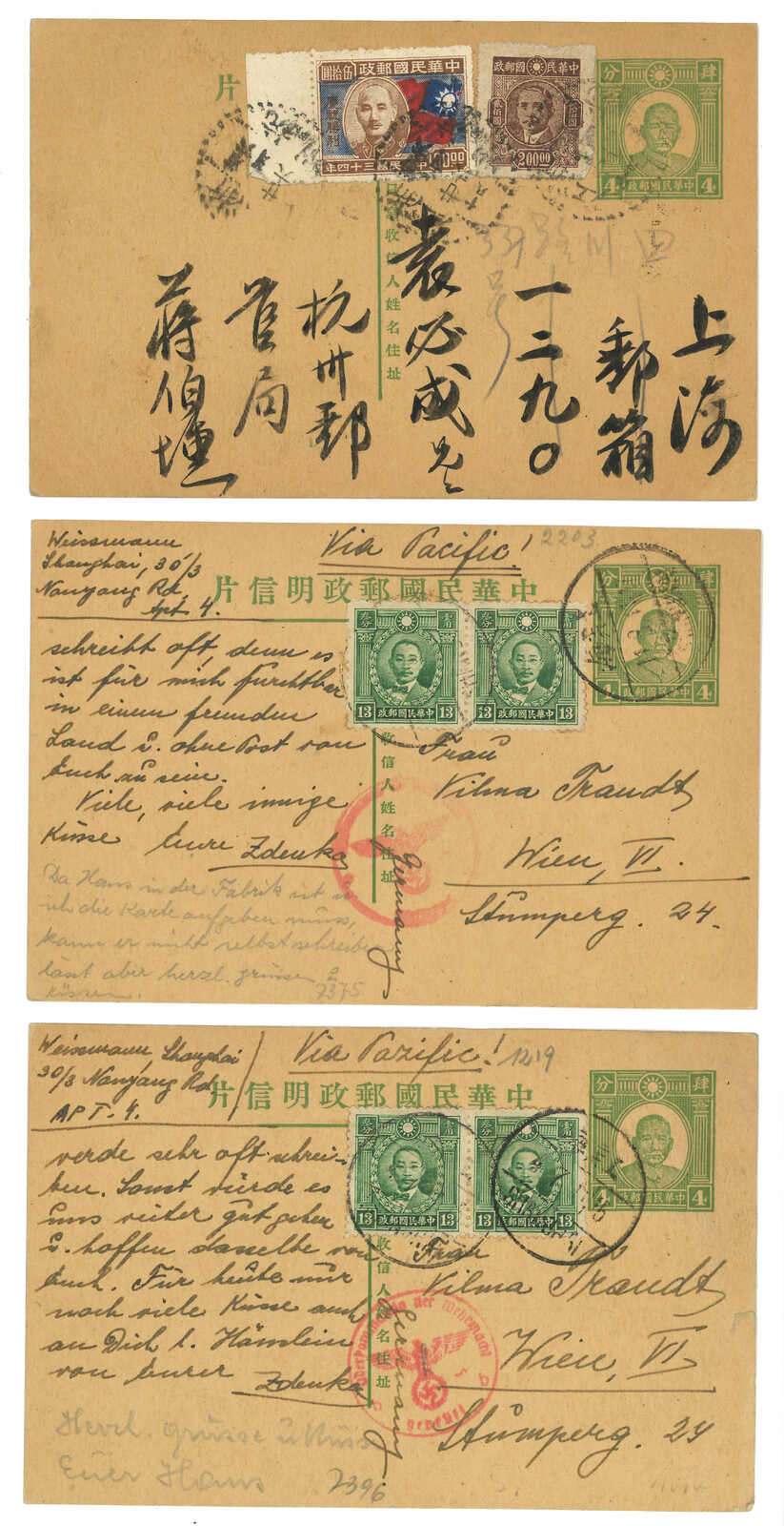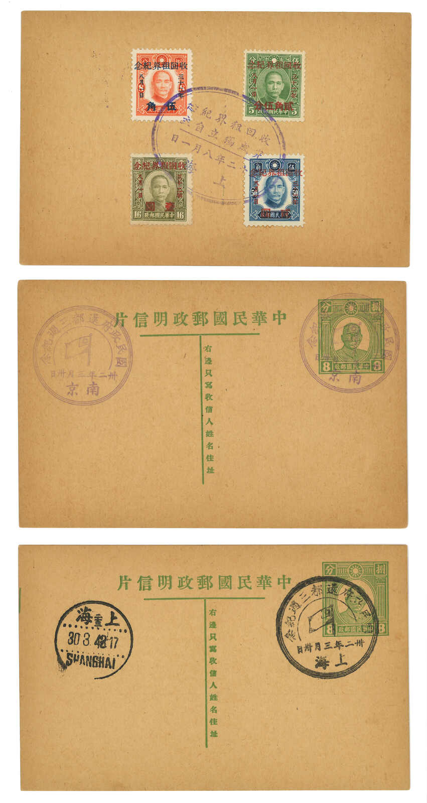 1941至1947年一組三件孫像第二版4分郵資片(韓目50),均自上海或杭州實寄。反映了戰時太平洋郵路及戰後之勝利紀念票貼用。(Image 1)
