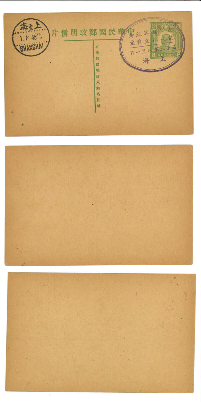 1941-1947 a group of 3 SYS 2nd print 4c PSC (Han 50), all commecially used from Shanghai and Hangchow. One Showcasing war time Pacific route as well as post-war Victory issue franking.