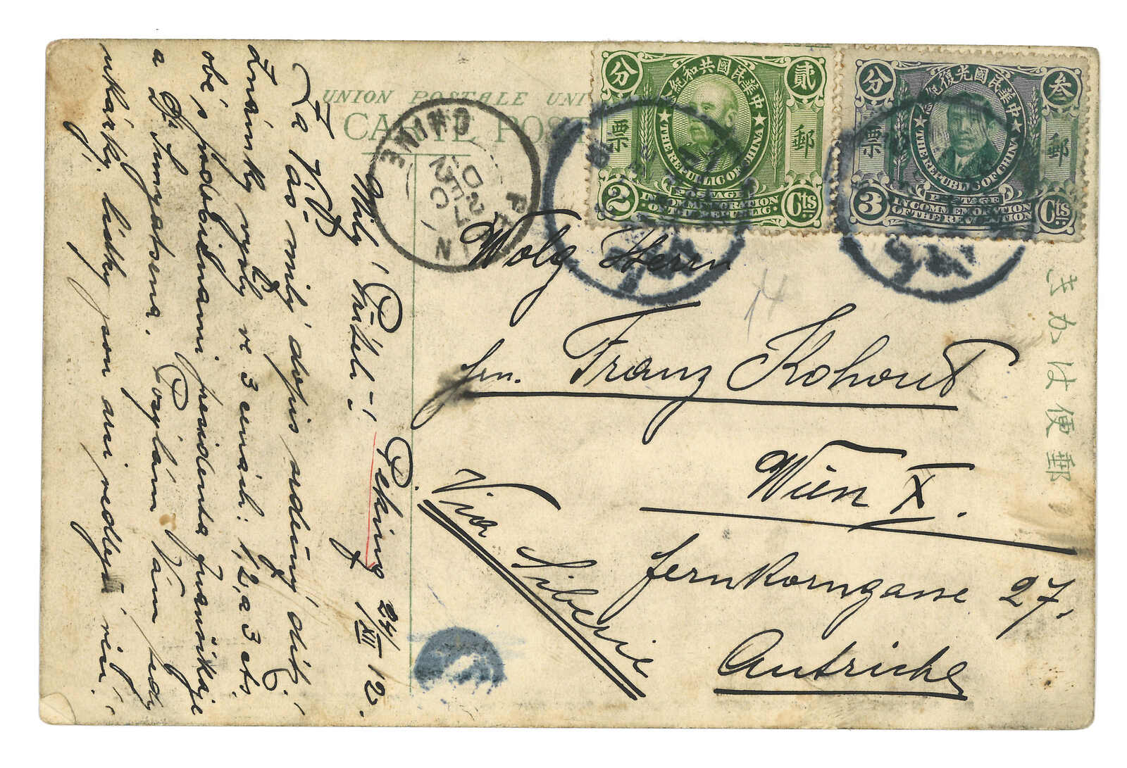 1912 (26 Dec) Assumption of President Dr. Sun PPC from Peking to Austria, f.w. Republic and Revolution commemorative issue 2c + 3c, tied by Peking bilingual cds. Transit Peking French PO (27 Dec). Early usage of Republic and