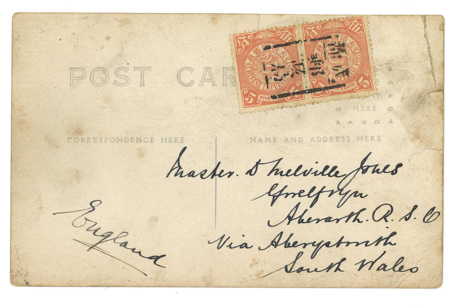 ca 1910s Huang Hsing PPC, from Shanghai to Englnad, f.w. Coiling Dragon 5c in pair and 2c, tied by Chengtu PO tombstone cancel and Shanghai cds respectively.
